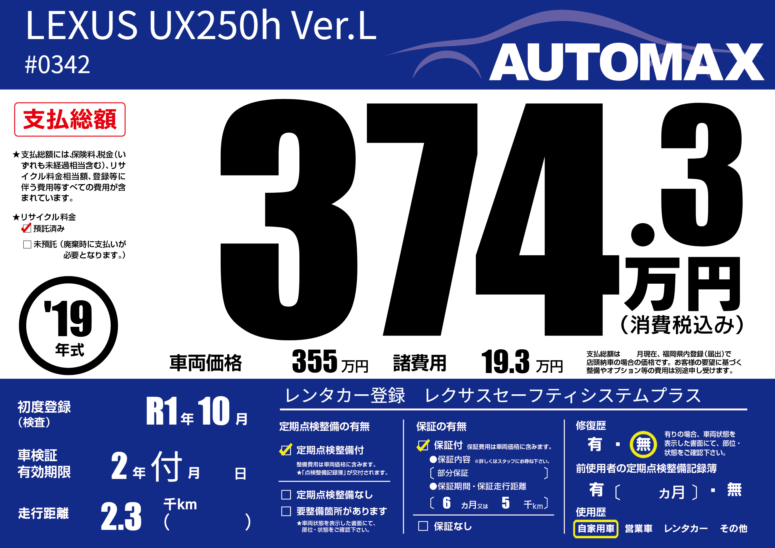| 車名 | LEXUS UX250h Ver.L | グレード ミッション 排気量 |