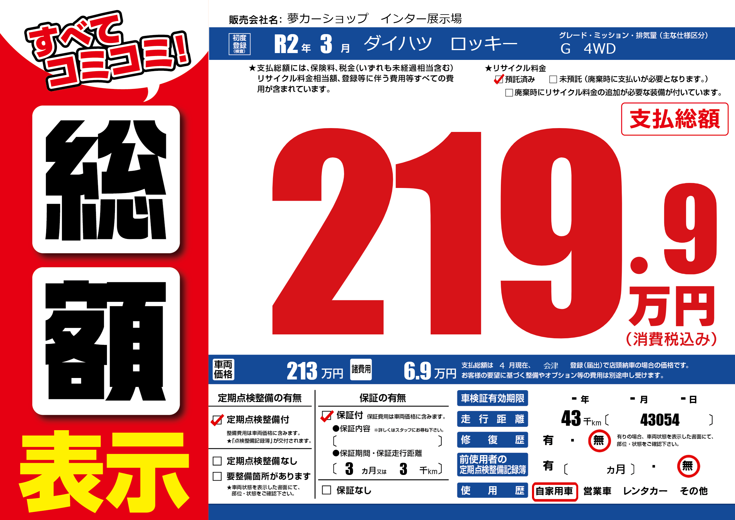 | 車名 | ダイハツ ロッキー | グレード ミッション 排気量 |