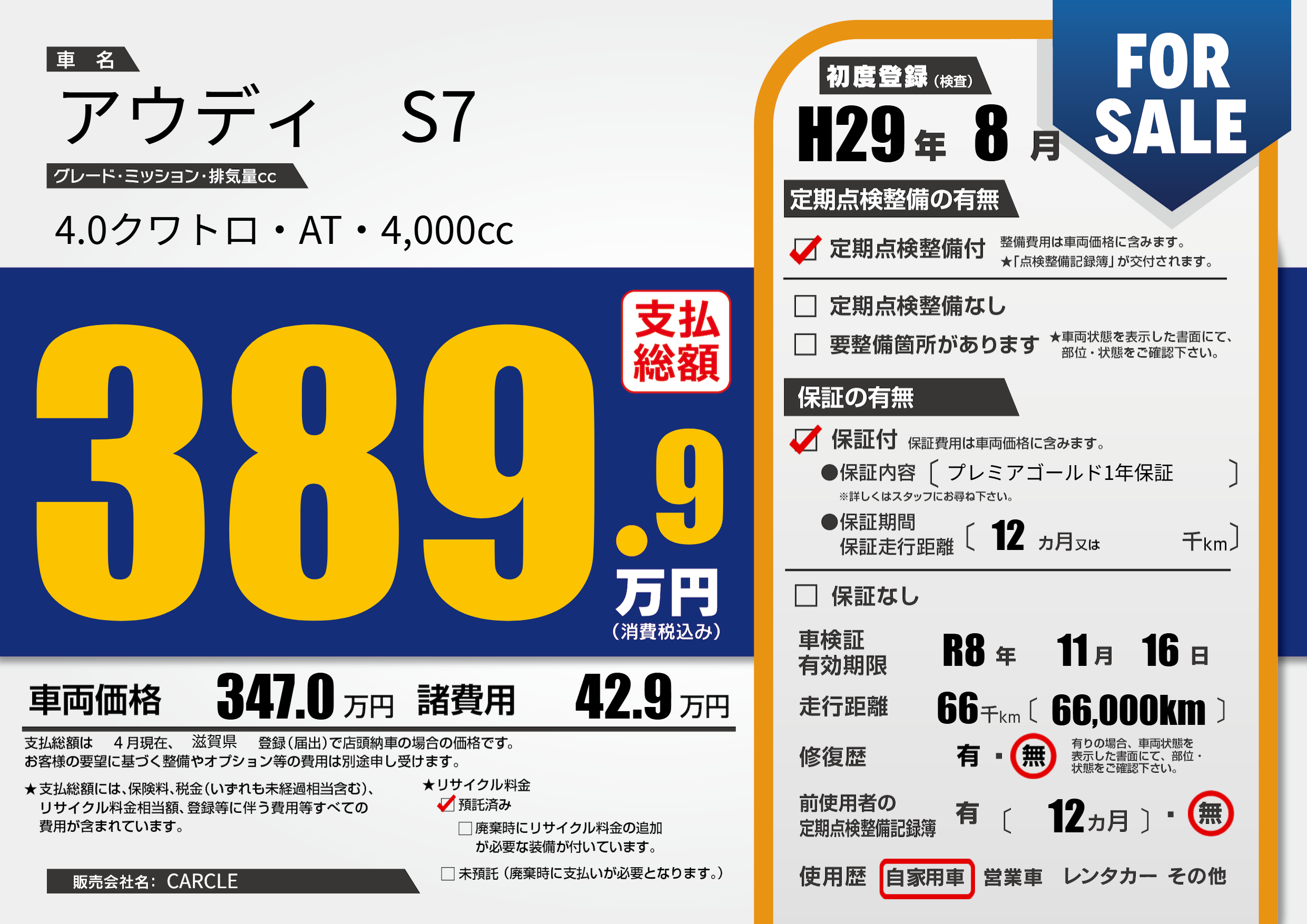 | 車名 | アウディ S7 | グレード ミッション 排気量 |