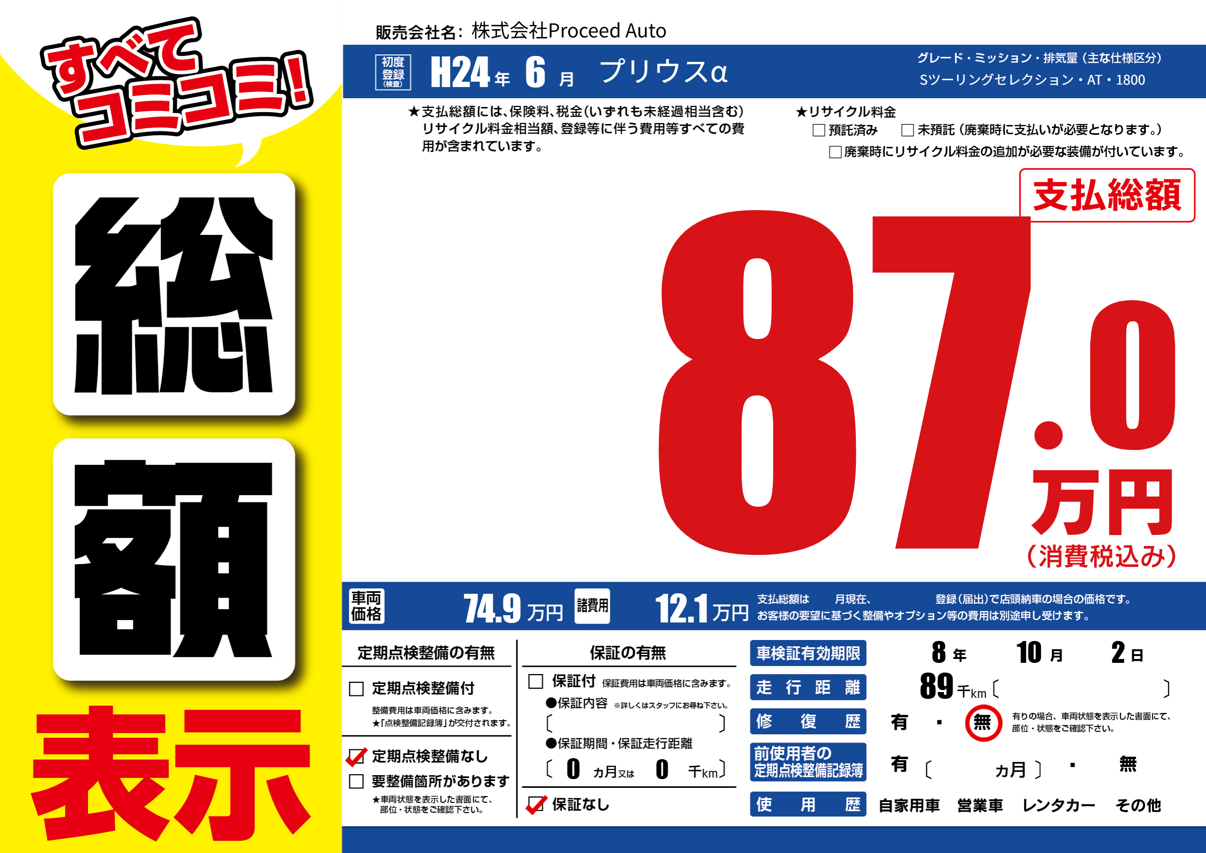 | 車名 | プリウスα | グレード ミッション 排気量 |