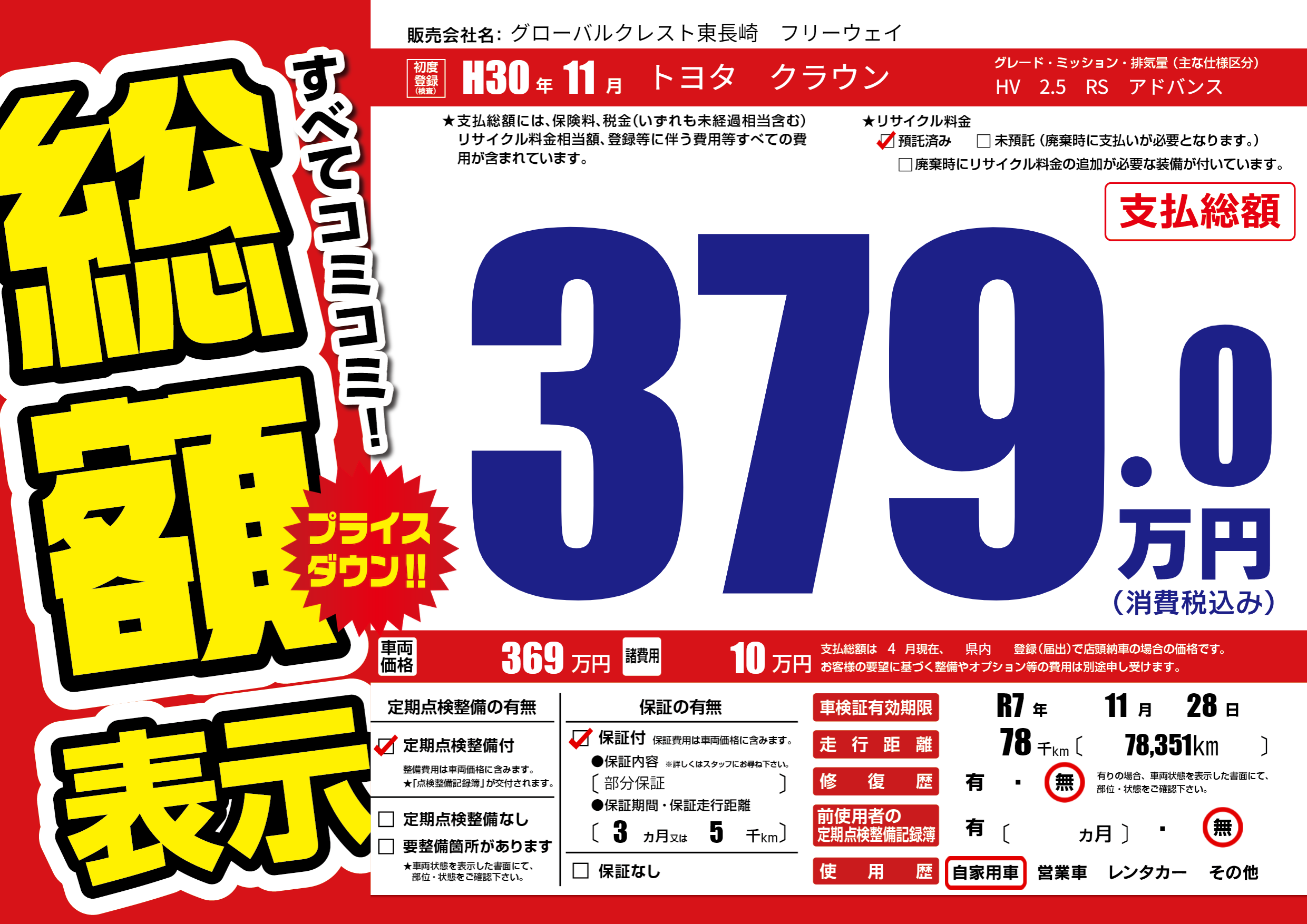| 走行キロ | 7.8万km | 初年度登録 | H30年11月 |