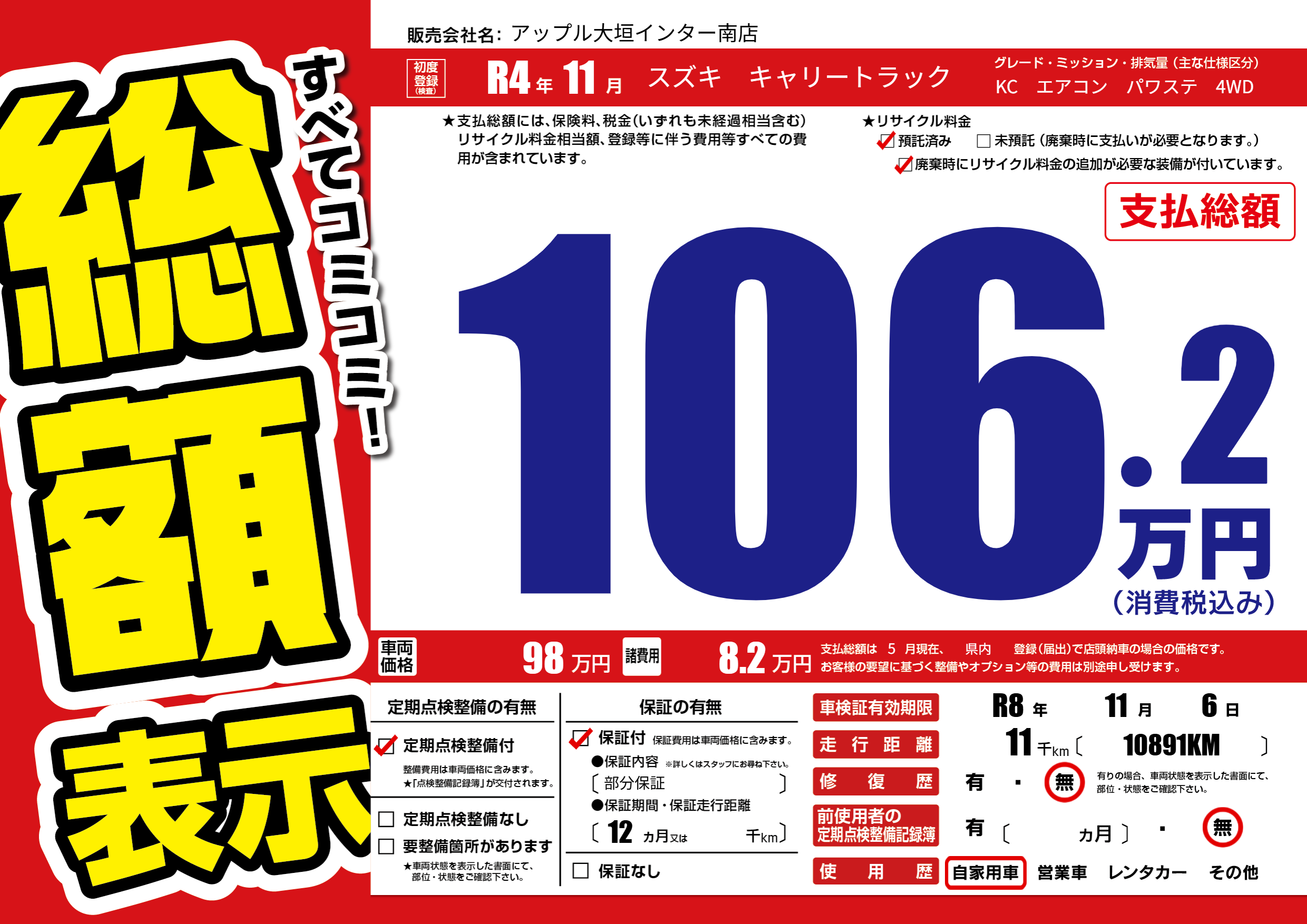 | 走行キロ | 1.1万km | 初年度登録 | R4年11月 |