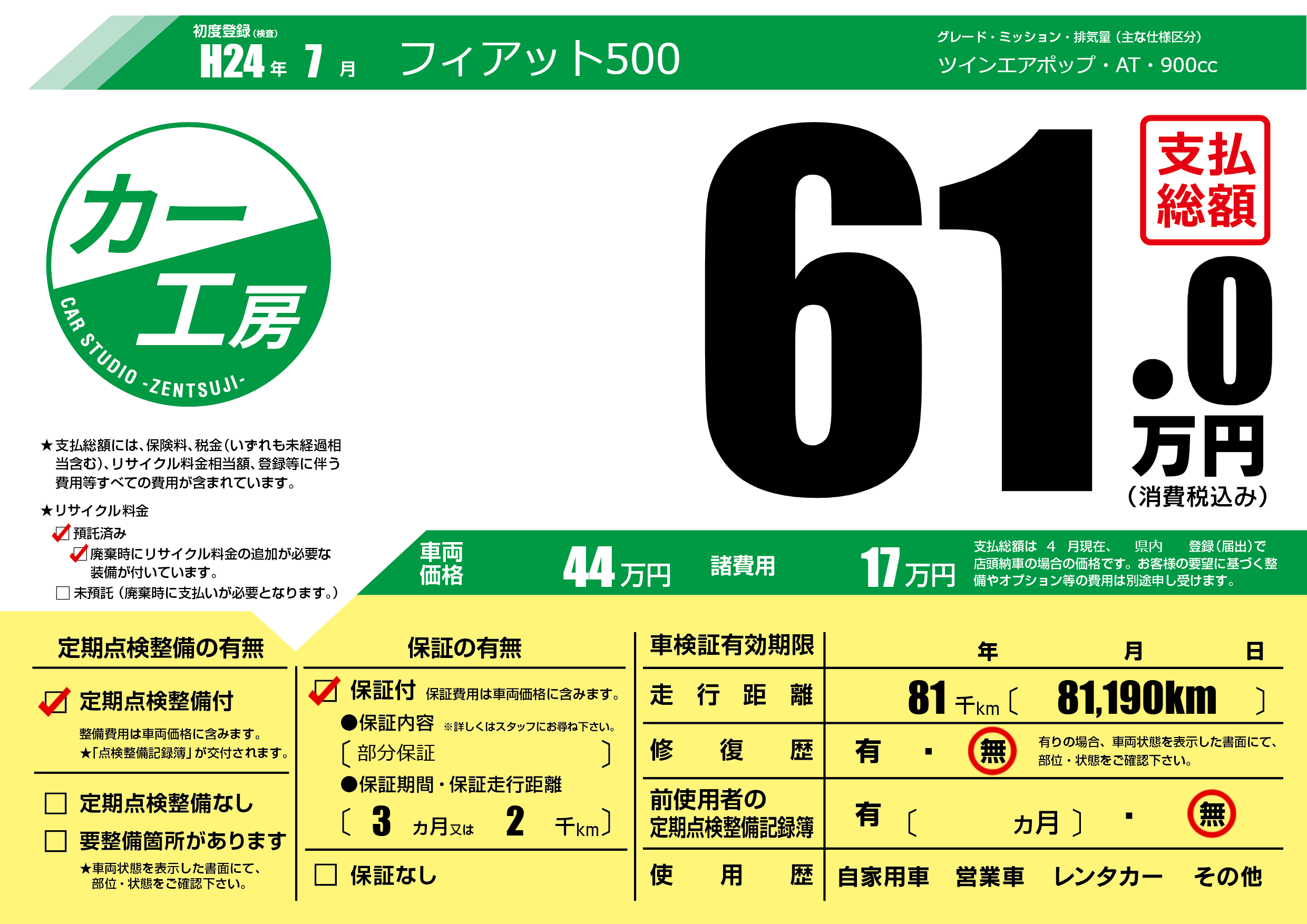 | 車名 | フィアット500 | グレード ミッション 排気量 |