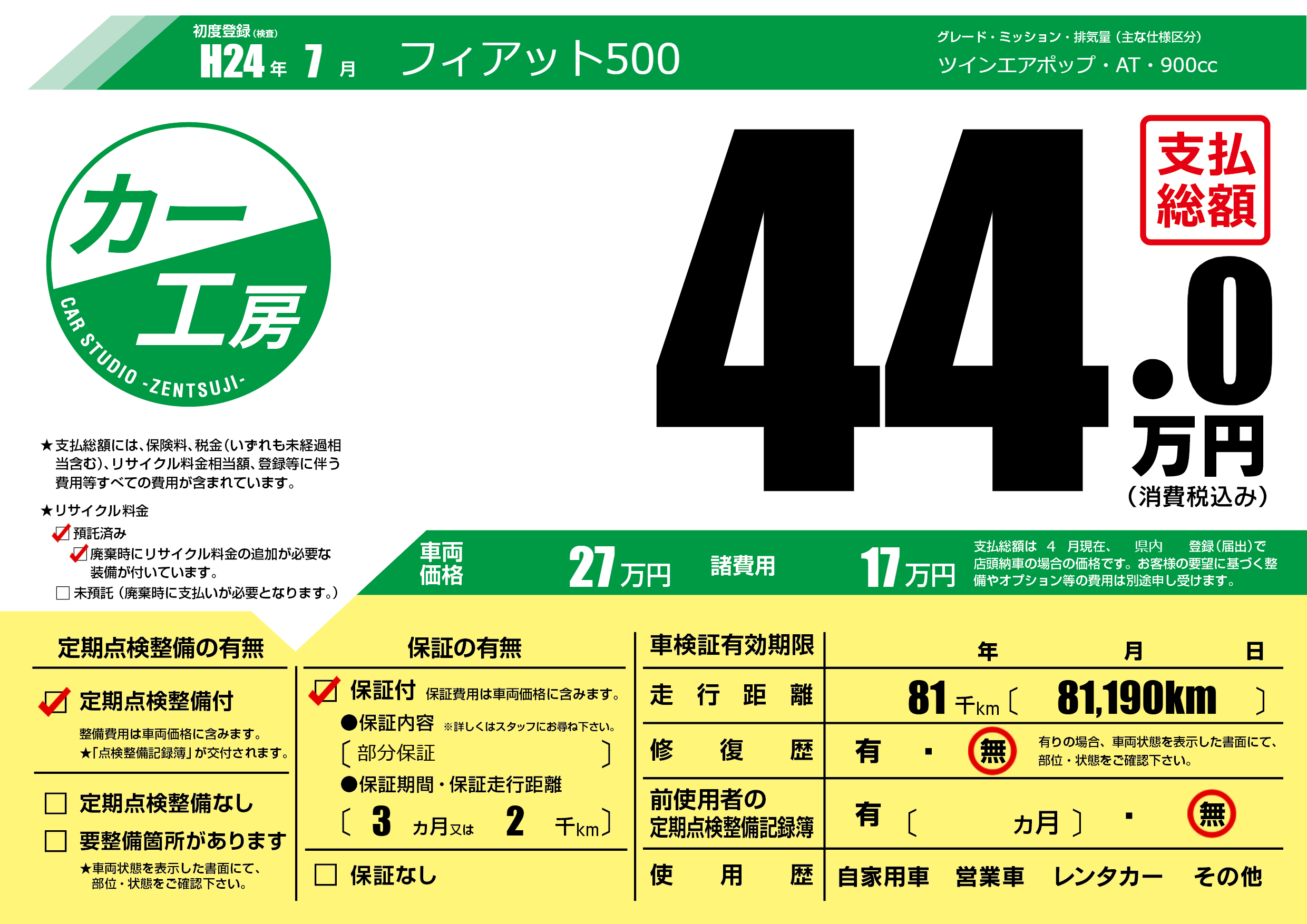 | 車名 | フィアット500 | グレード ミッション 排気量 |