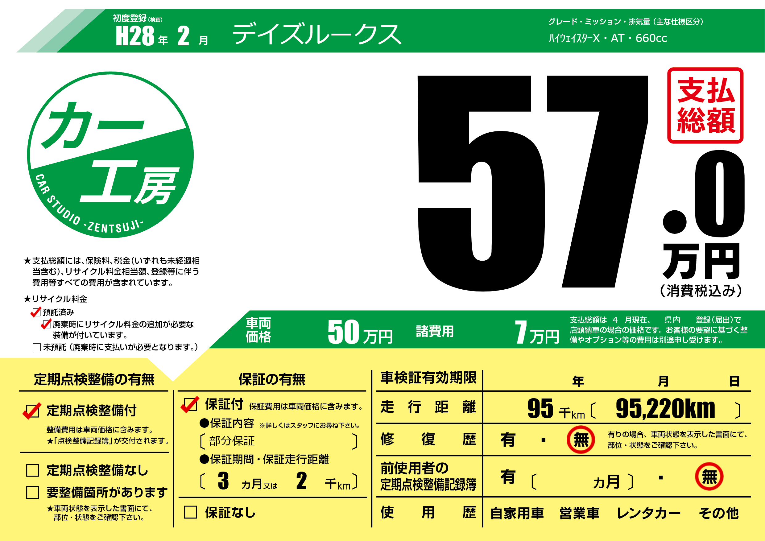 | 走行キロ | 9.5万km | 初年度登録 | H28年2月 |