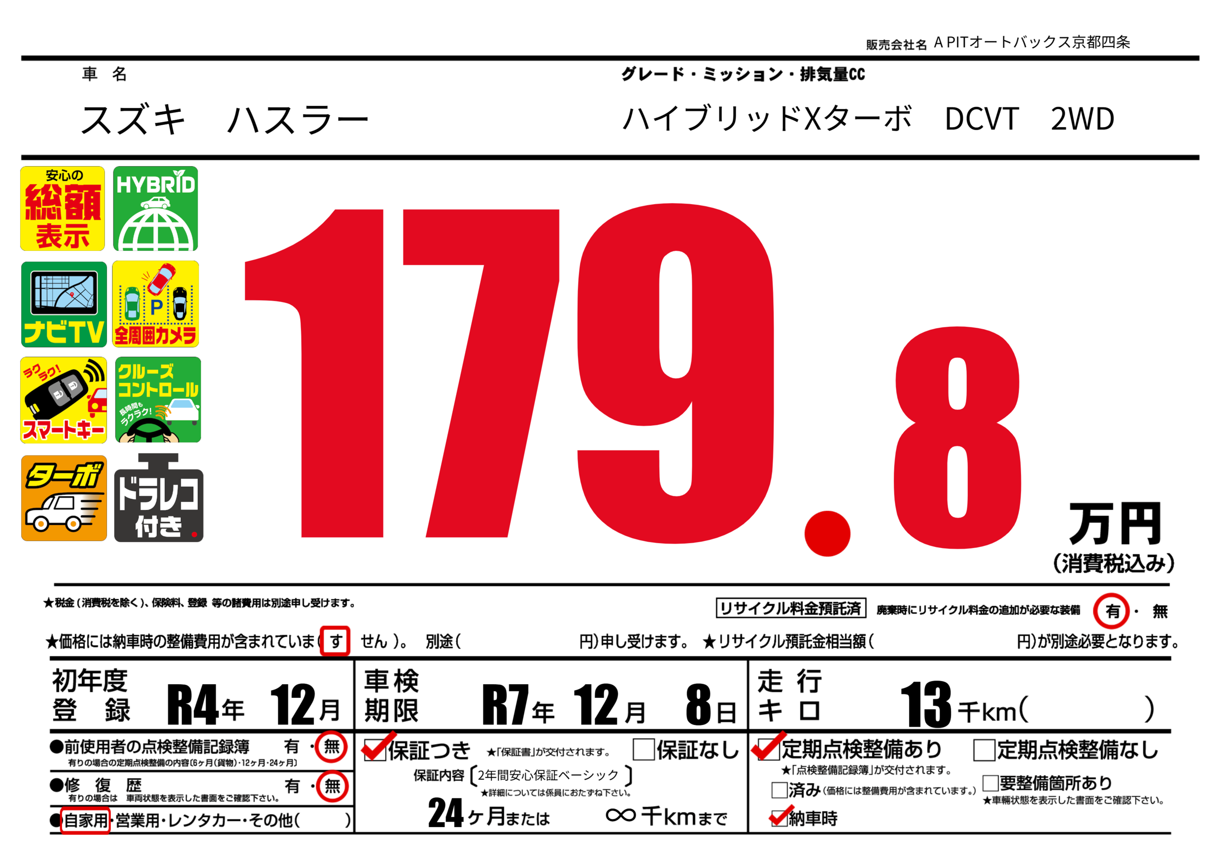 保証なし 保証内容(2年間安心保証ベーシック) 24ヶ月または(∞)千kmまで |