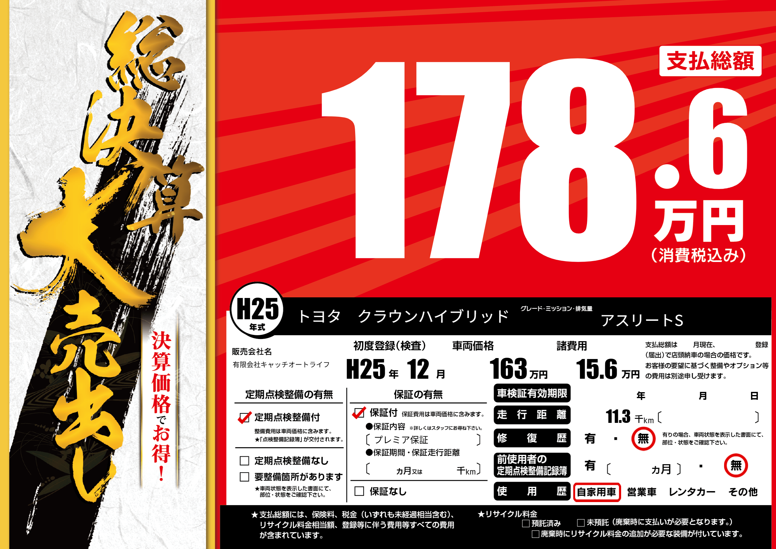| 車名 | トヨタ クラウンハイブリッド | グレード ミッション 排気量 |