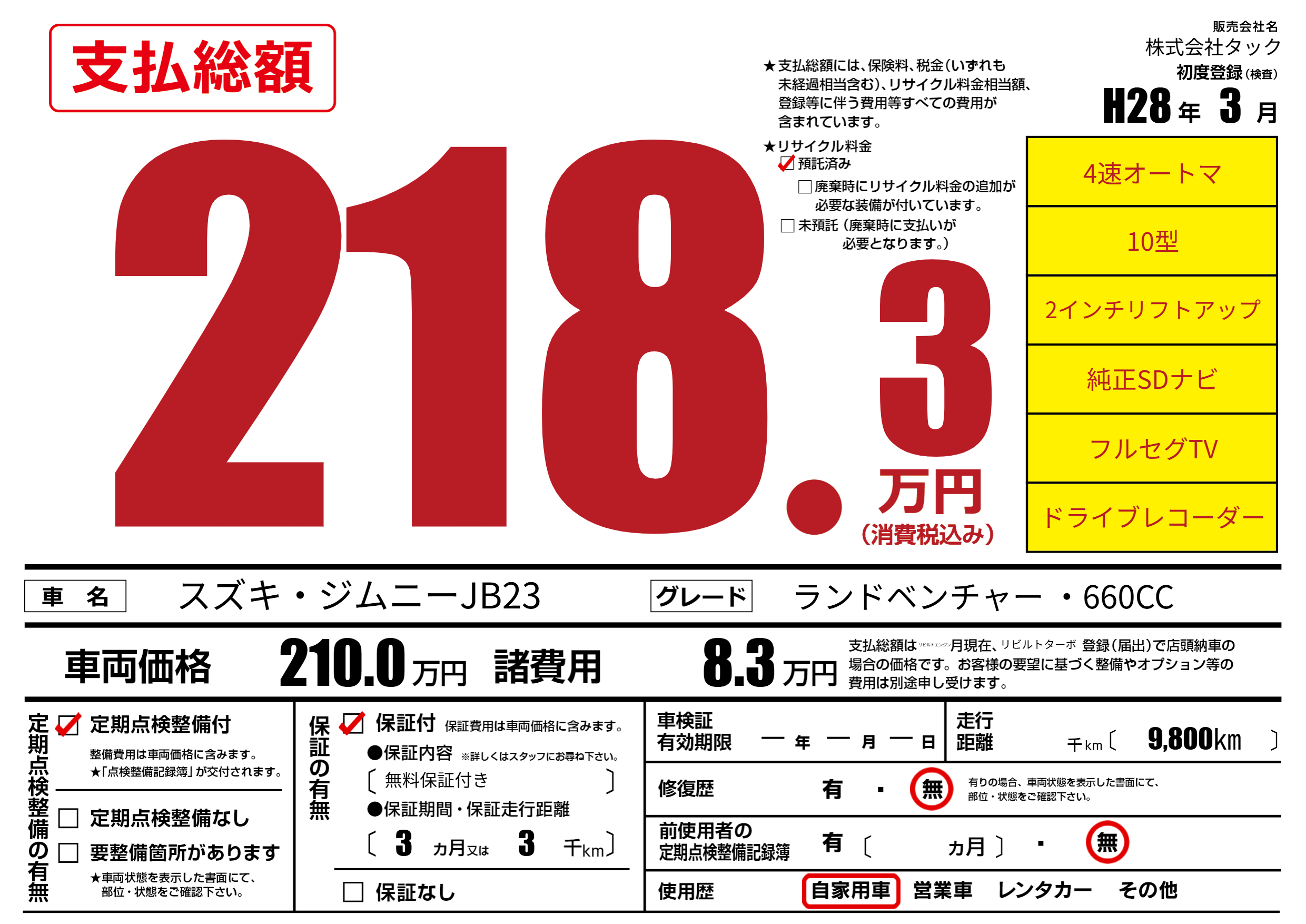 保証なし 保証内容(無料保証付き) 3ヶ月または(3)千kmまで |