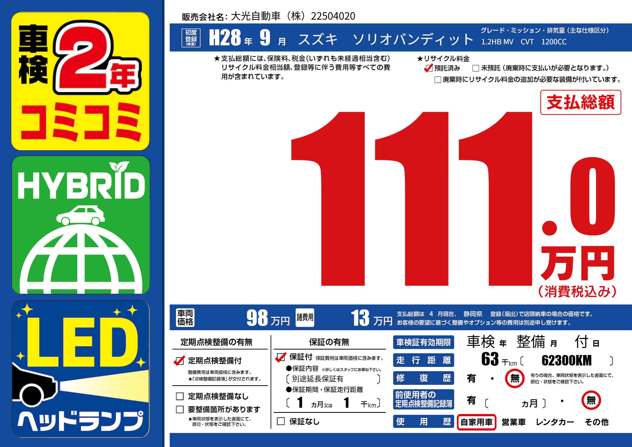 | 車名 | スズキ ソリオバンディット | グレード ミッション 排気量 |