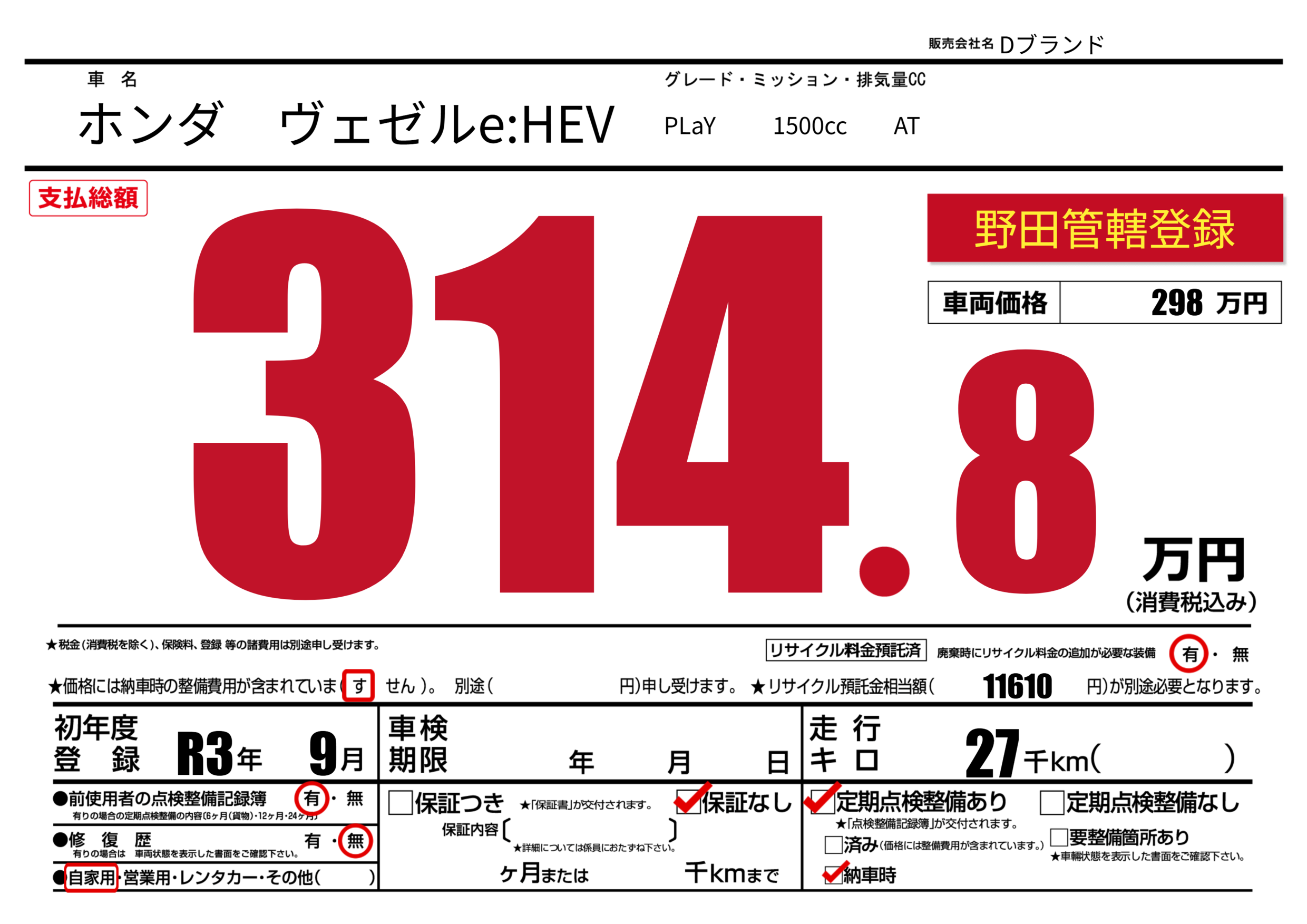 | 車名 | ホンダ ヴェゼルe:HEV | グレード ミッション 排気量 |