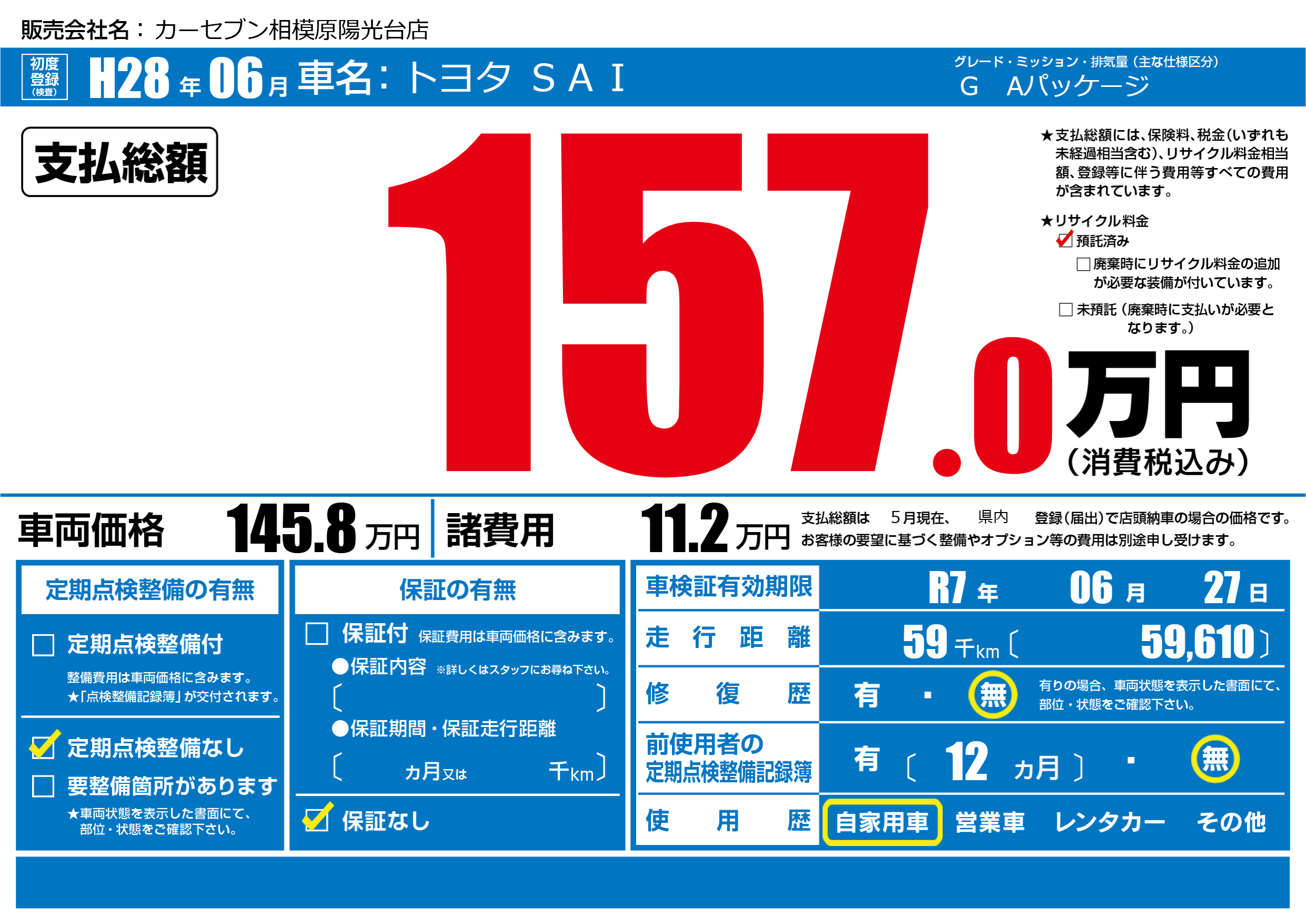 | 車検制限 | R7年 06月 27日 | ||