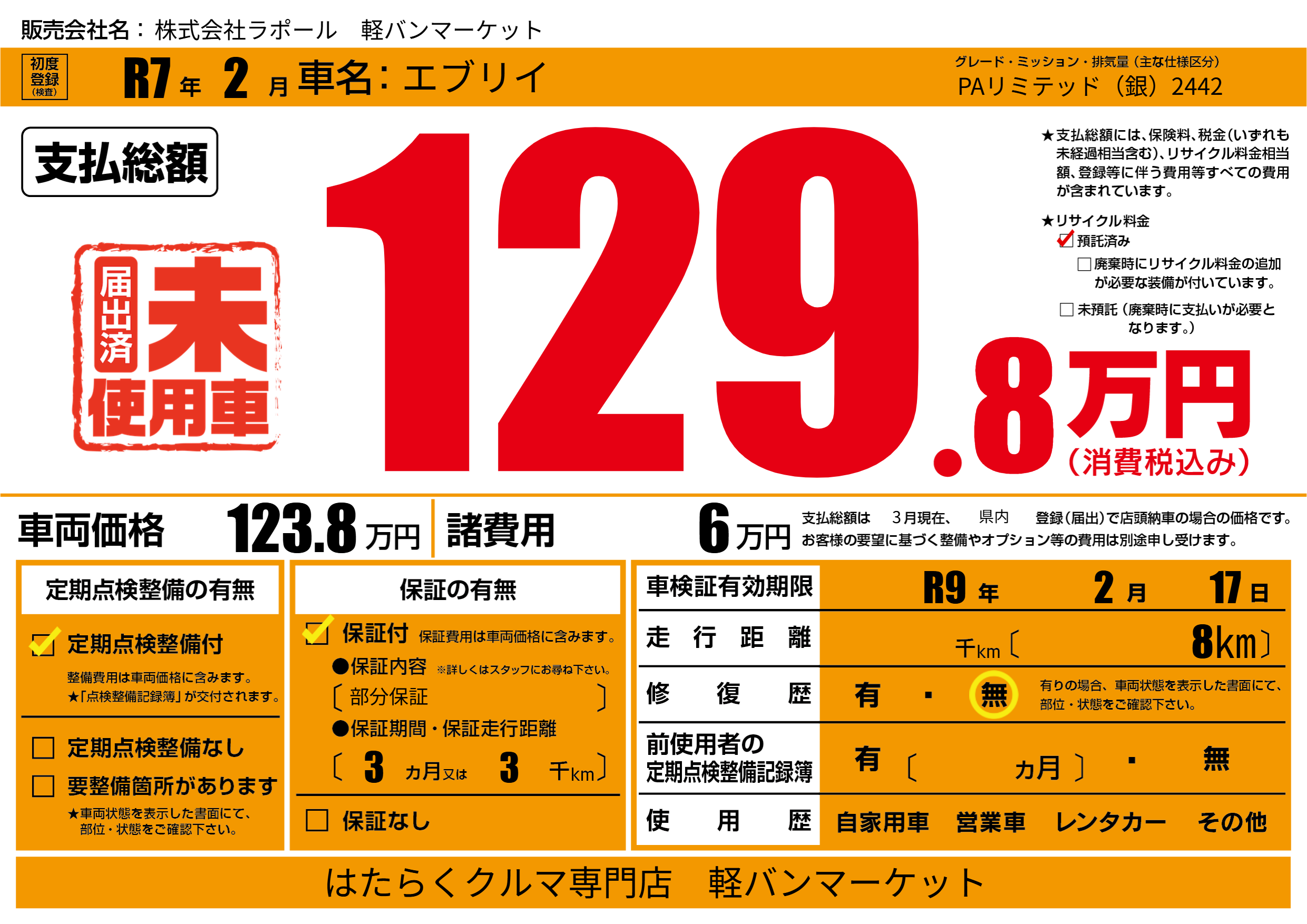 | 走行キロ | - | 初年度登録 | R7年2月 |