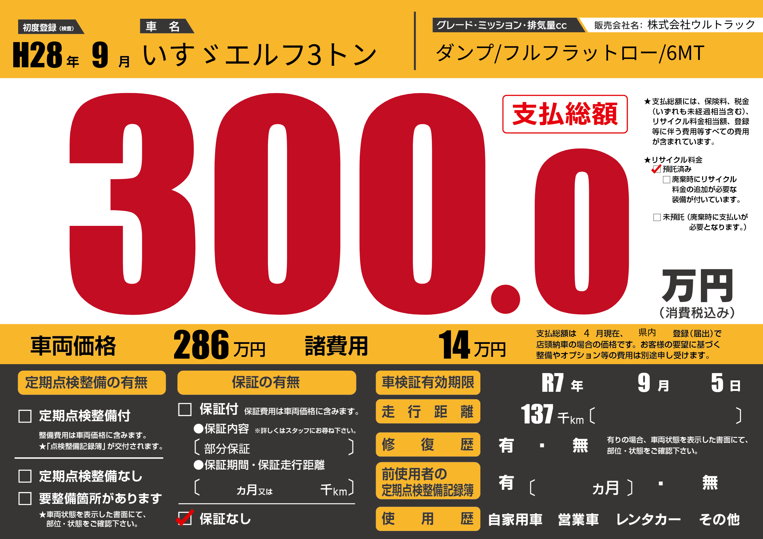 | 車名 | いすゞエルフ3トン | グレード ミッション 排気量 |