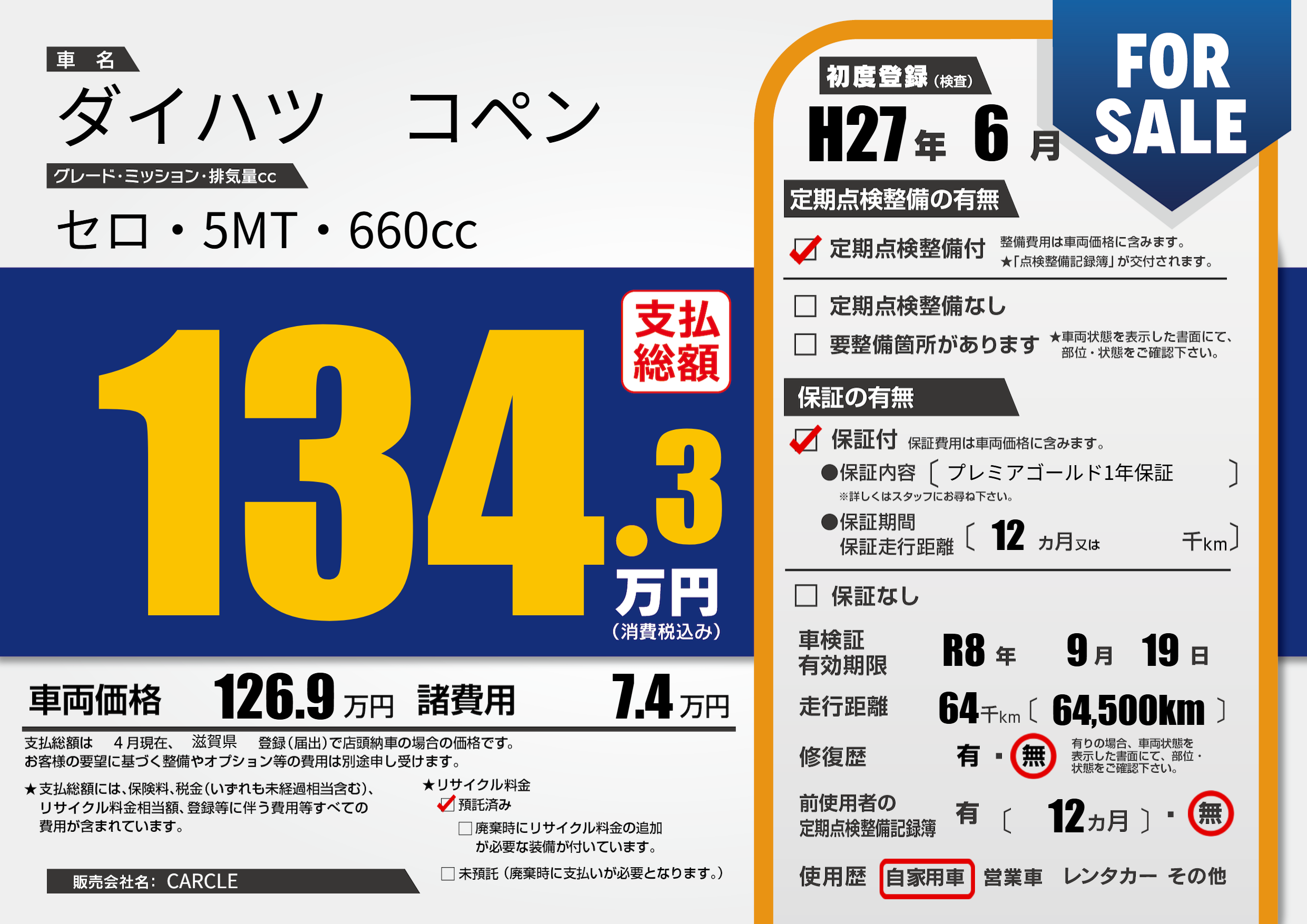 | 車名 | ダイハツ コペン | グレード ミッション 排気量 |
