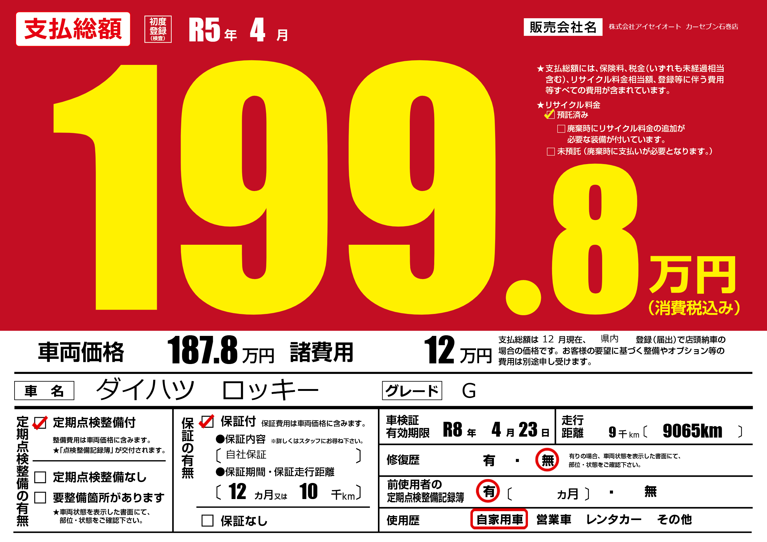 | 車名 | ダイハツ ロッキー | グレード ミッション 排気量 |