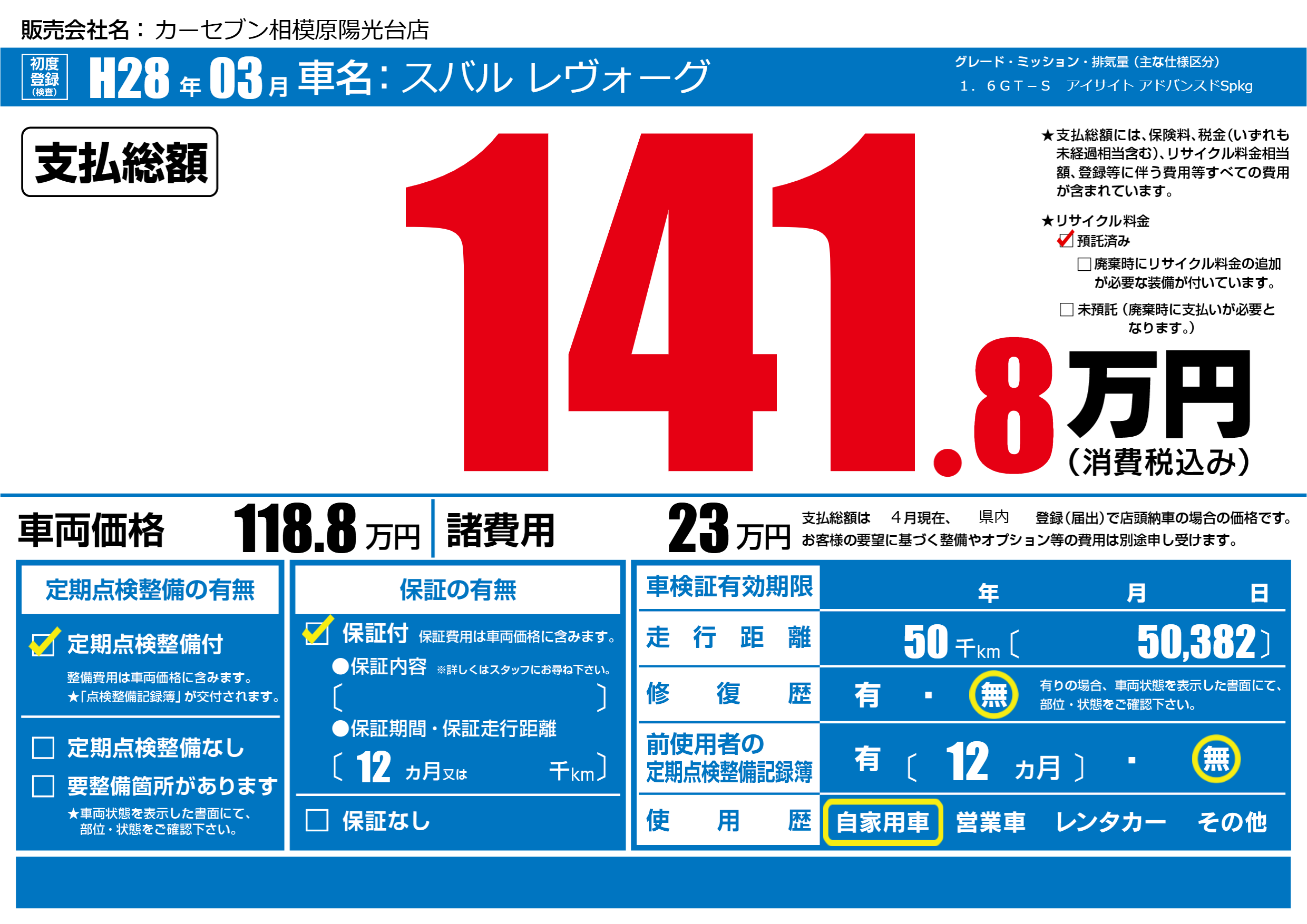| 車名 | スバル レヴォーグ | グレード ミッション 排気量 |