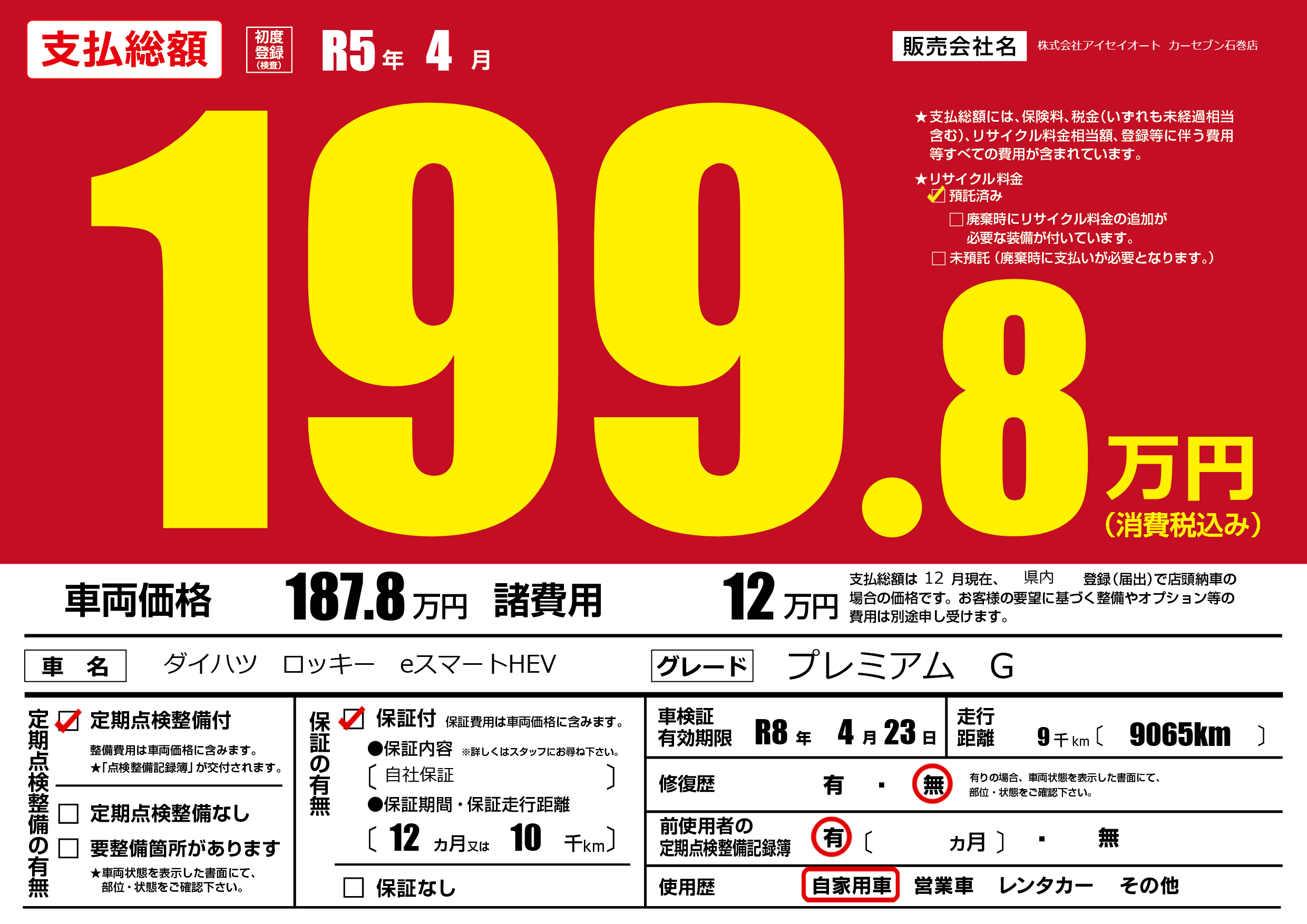 | 走行キロ | 0.9万km | 初年度登録 | R5年4月 |