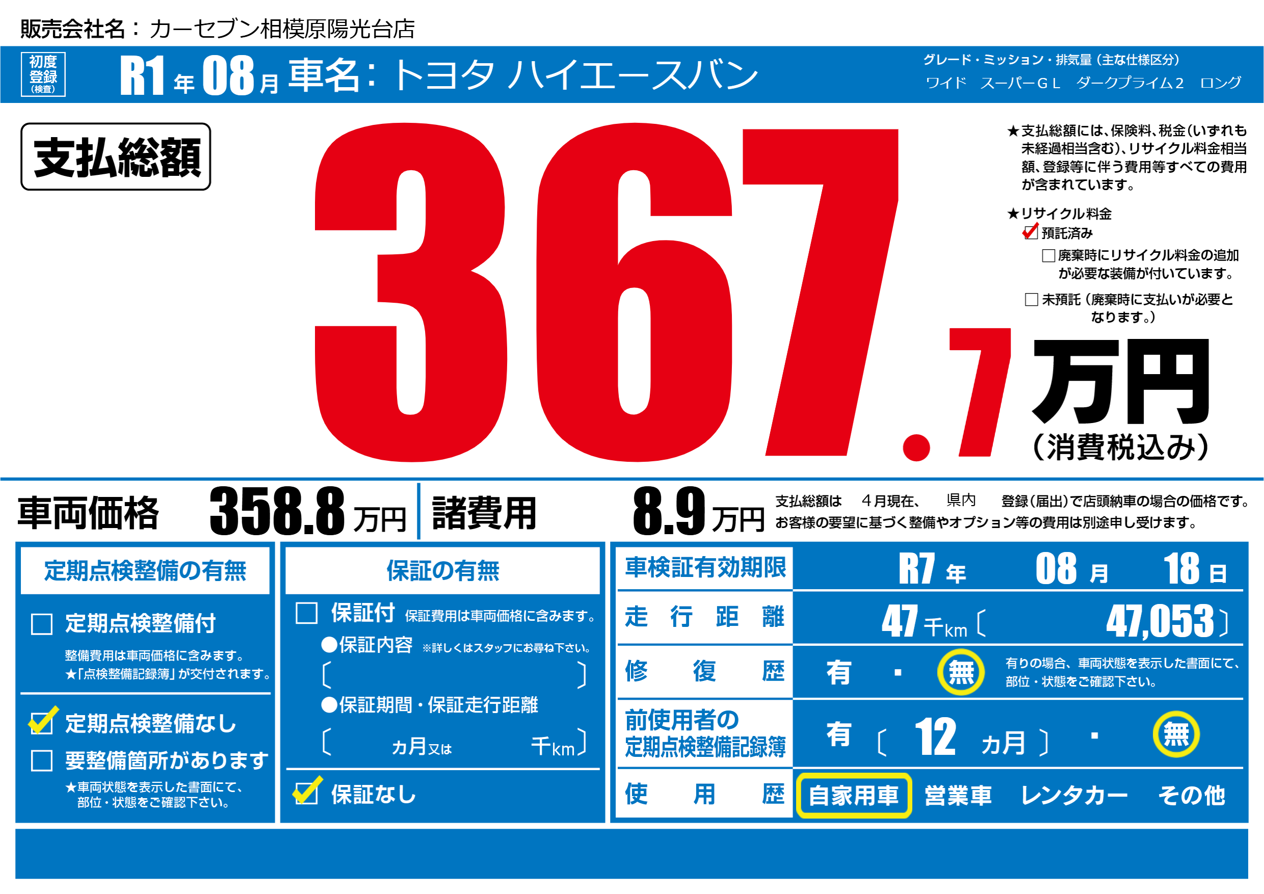 | 走行キロ | 4.7万km | 初年度登録 | R1年08月 |