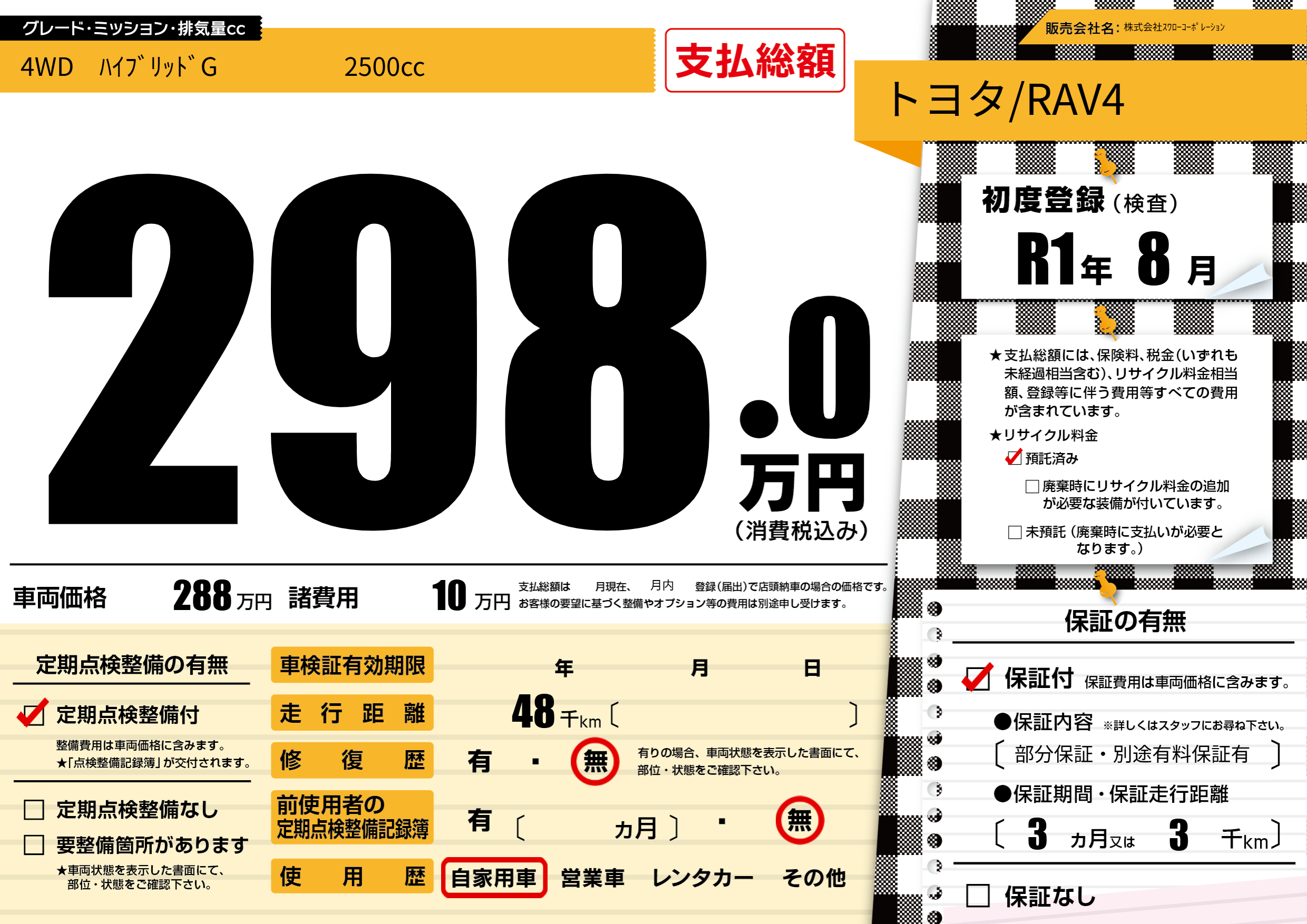 | 車名 | トヨタ/RAV4 | グレード ミッション 排気量 |