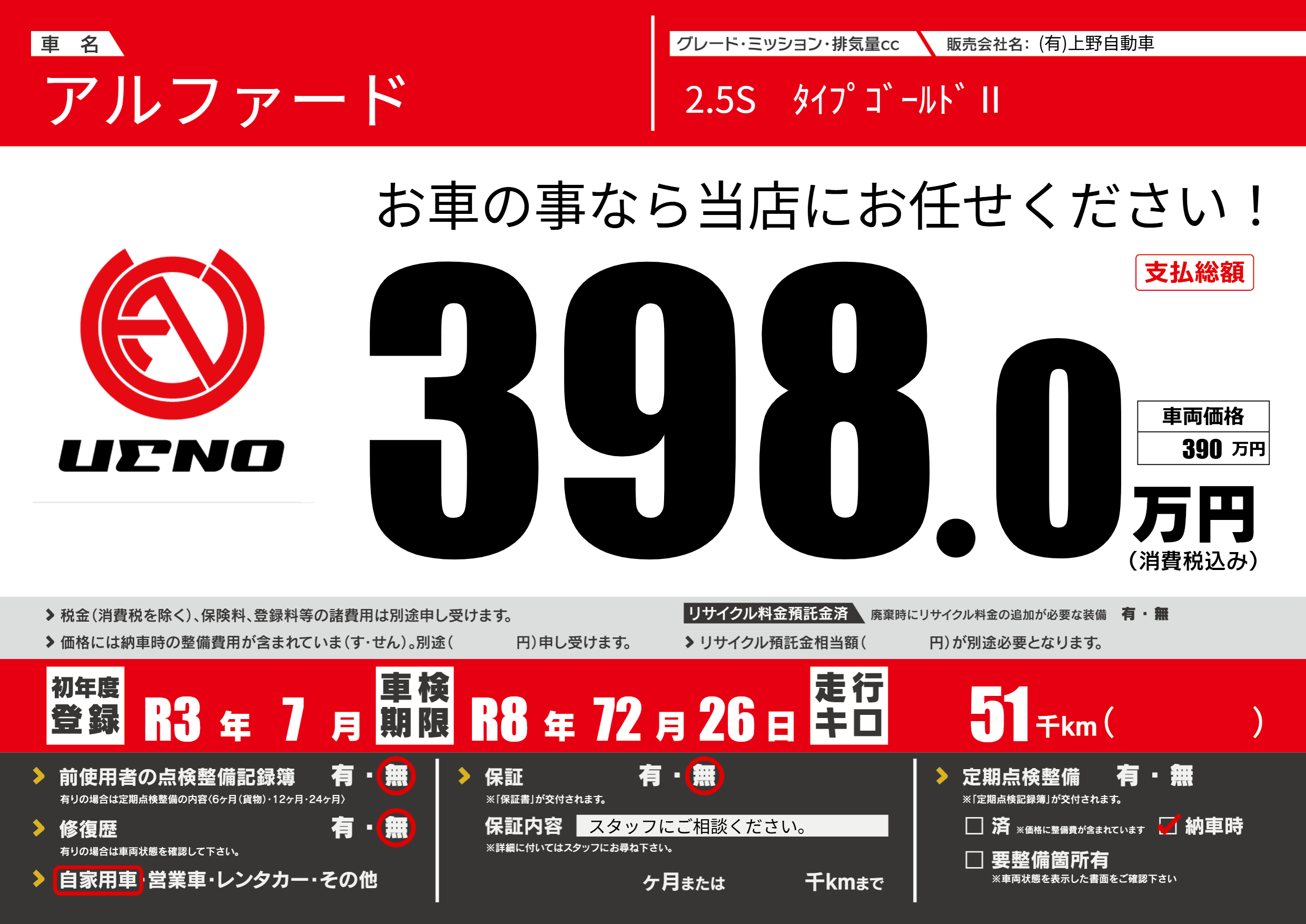 | 車名 | アルファード | グレード ミッション 排気量 |