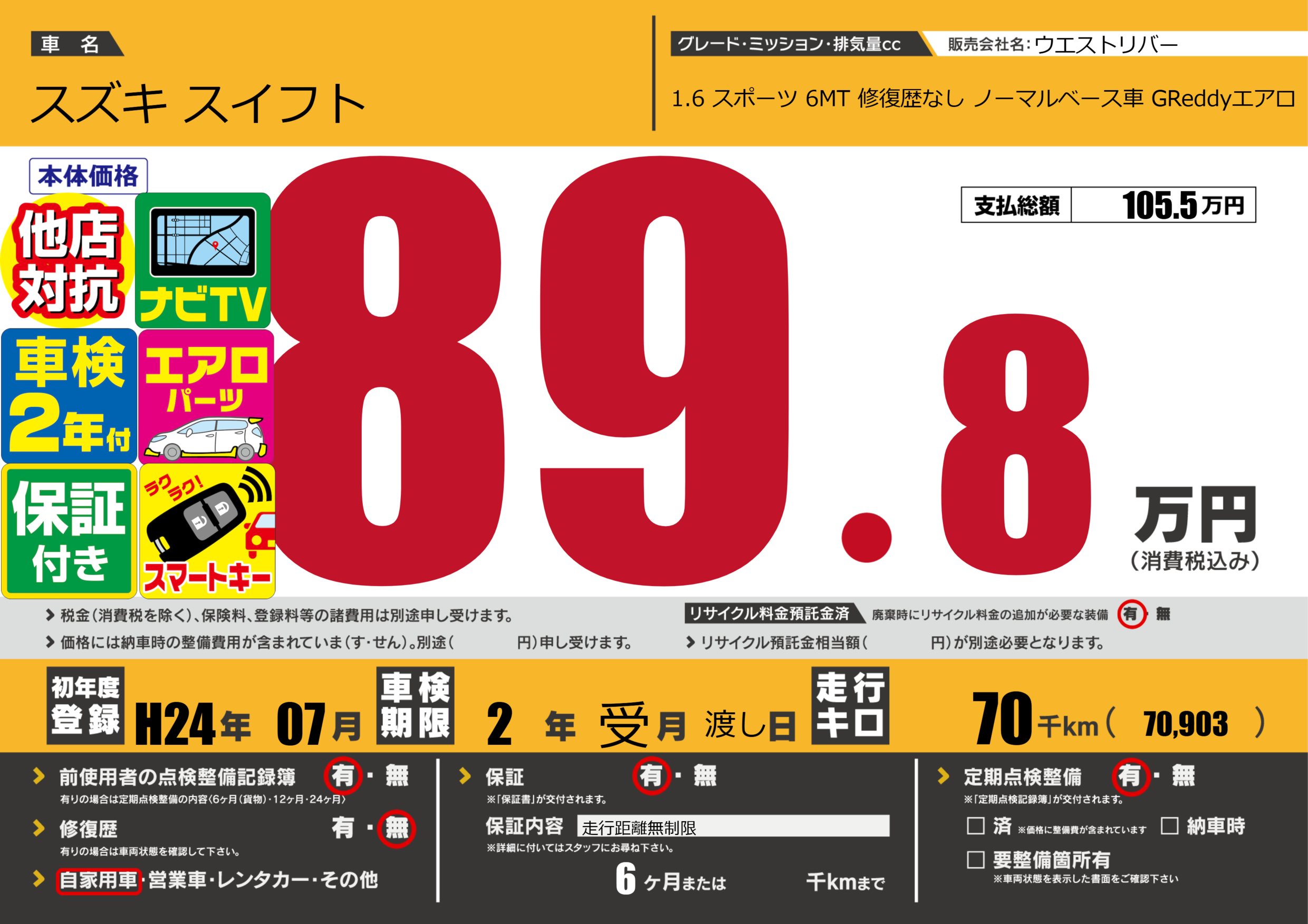 | 車名 | スズキ スイフト | グレード ミッション 排気量 |