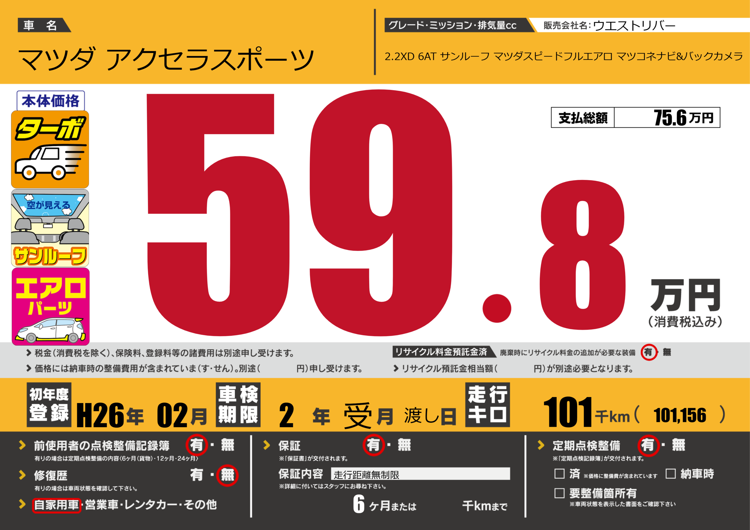 | 車名 | マツダ アクセラスポーツ | グレード ミッション 排気量 |