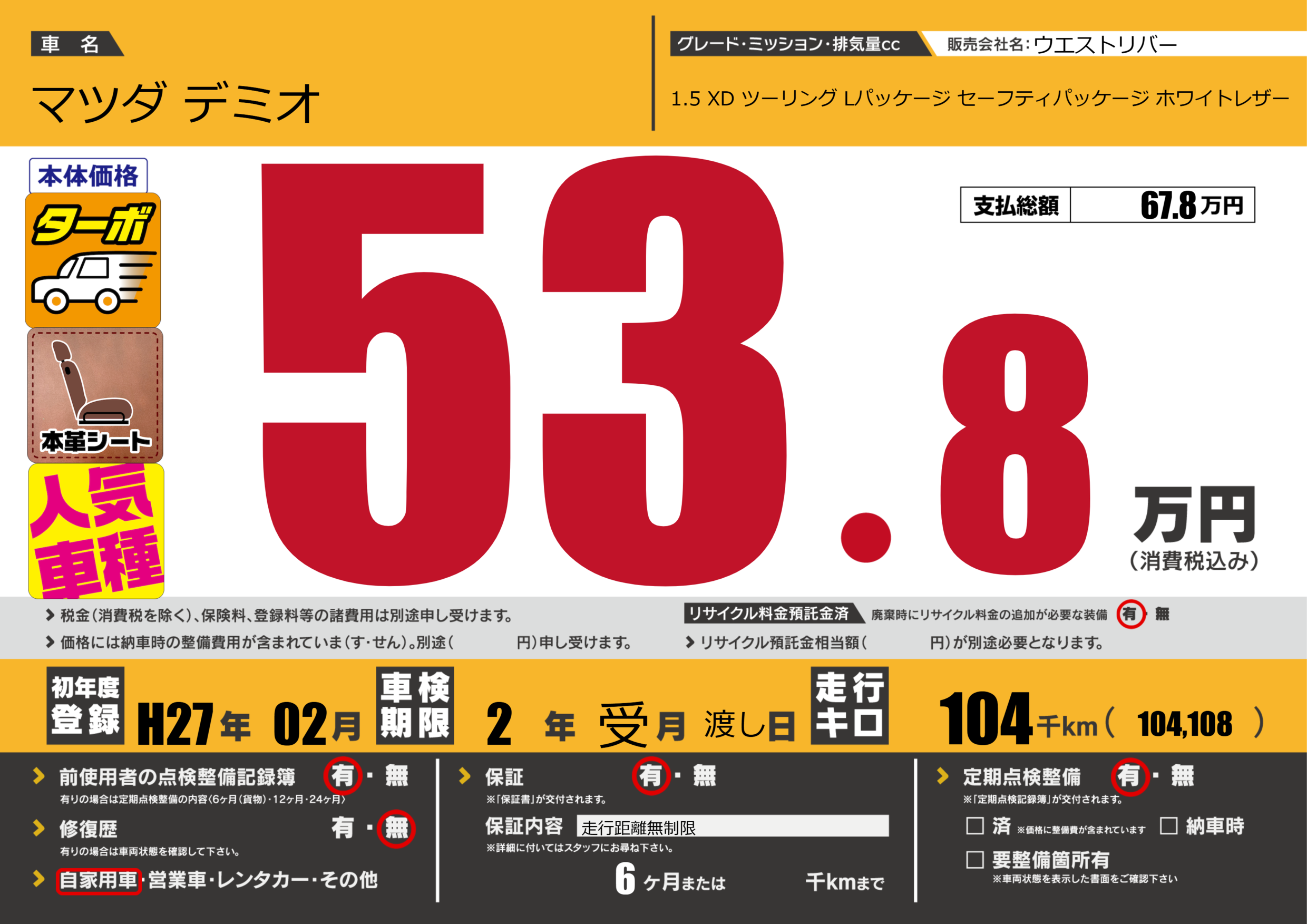 | 車名 | マツダ デミオ | グレード ミッション 排気量 |