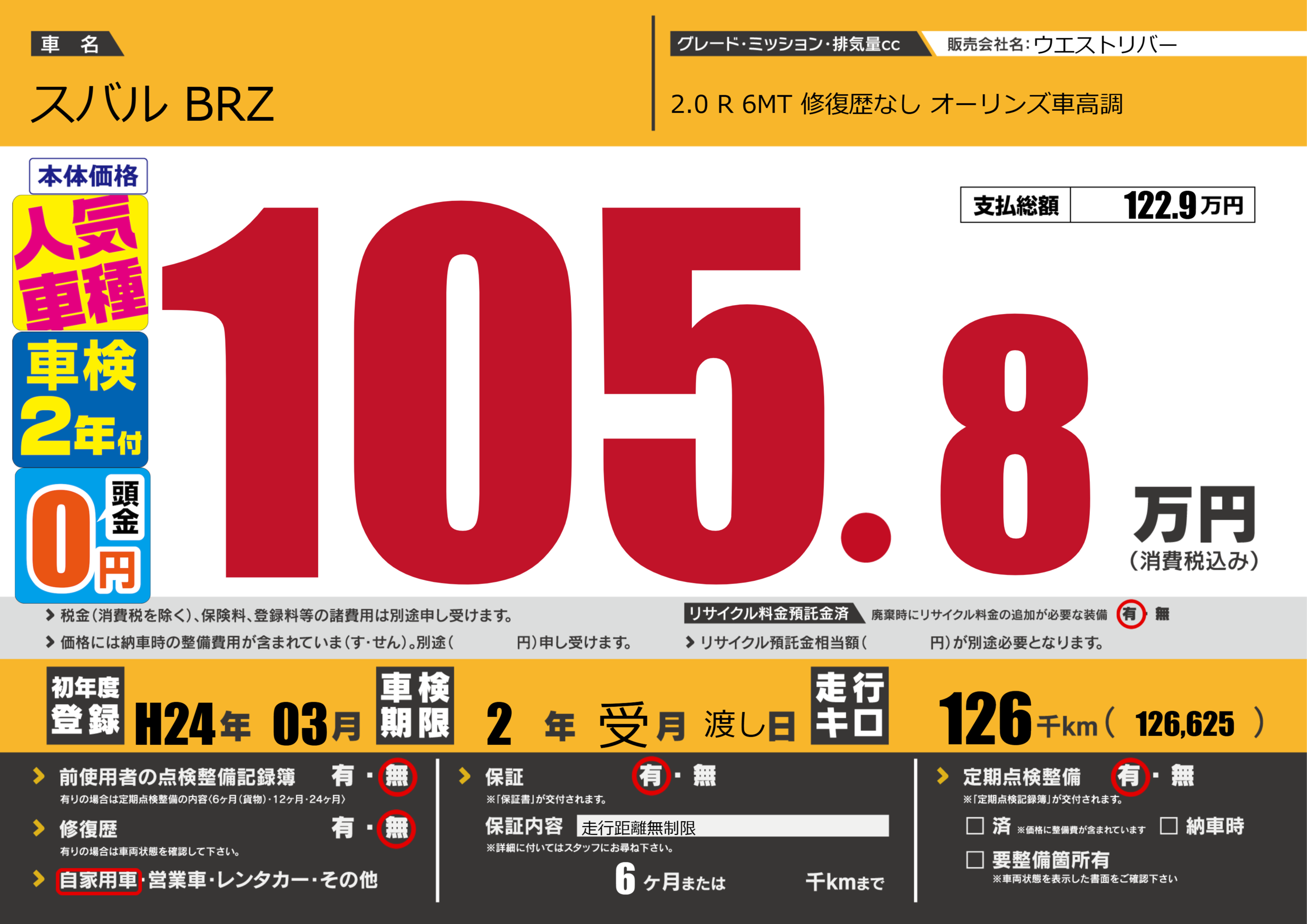 | 車名 | スバル BRZ | グレード ミッション 排気量 |