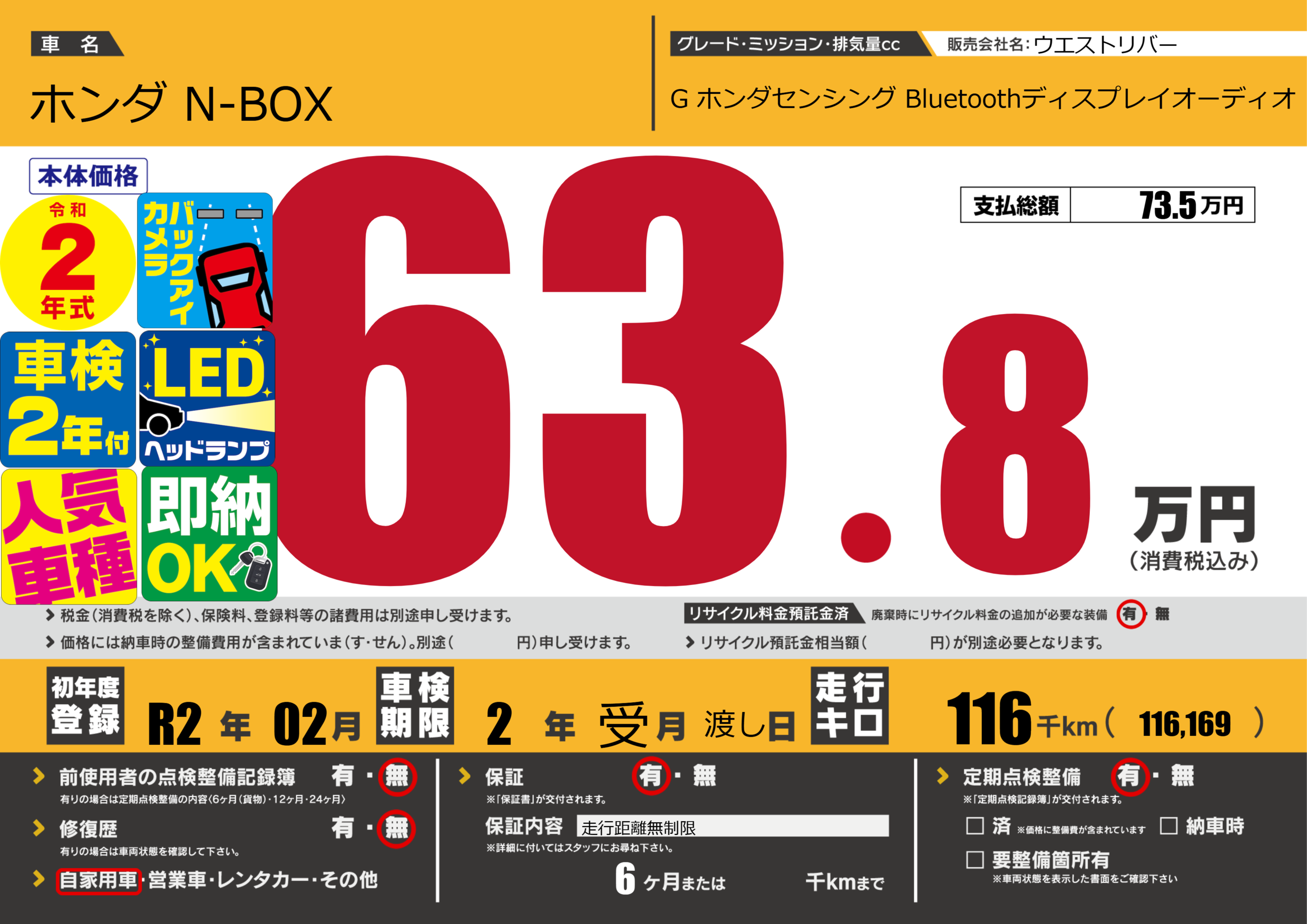 | 車名 | ホンダ N-BOX | グレード ミッション 排気量 |