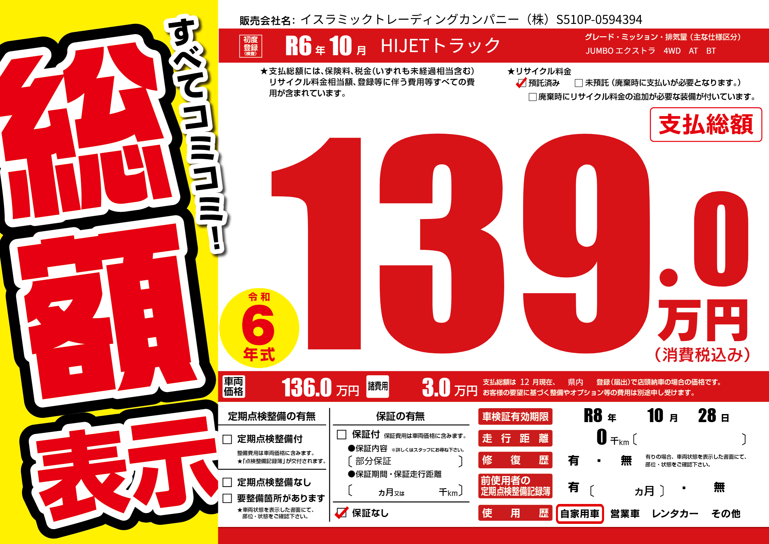 | 走行キロ | - | 初年度登録 | R6年10月 |