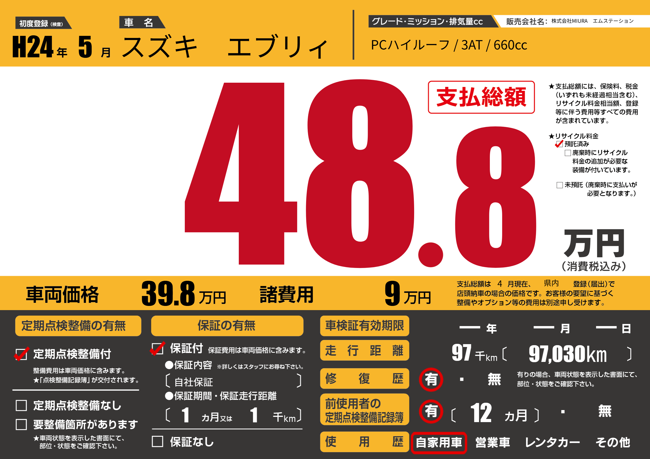 | 走行キロ | 9.7万km | 初年度登録 | H24年5月 |