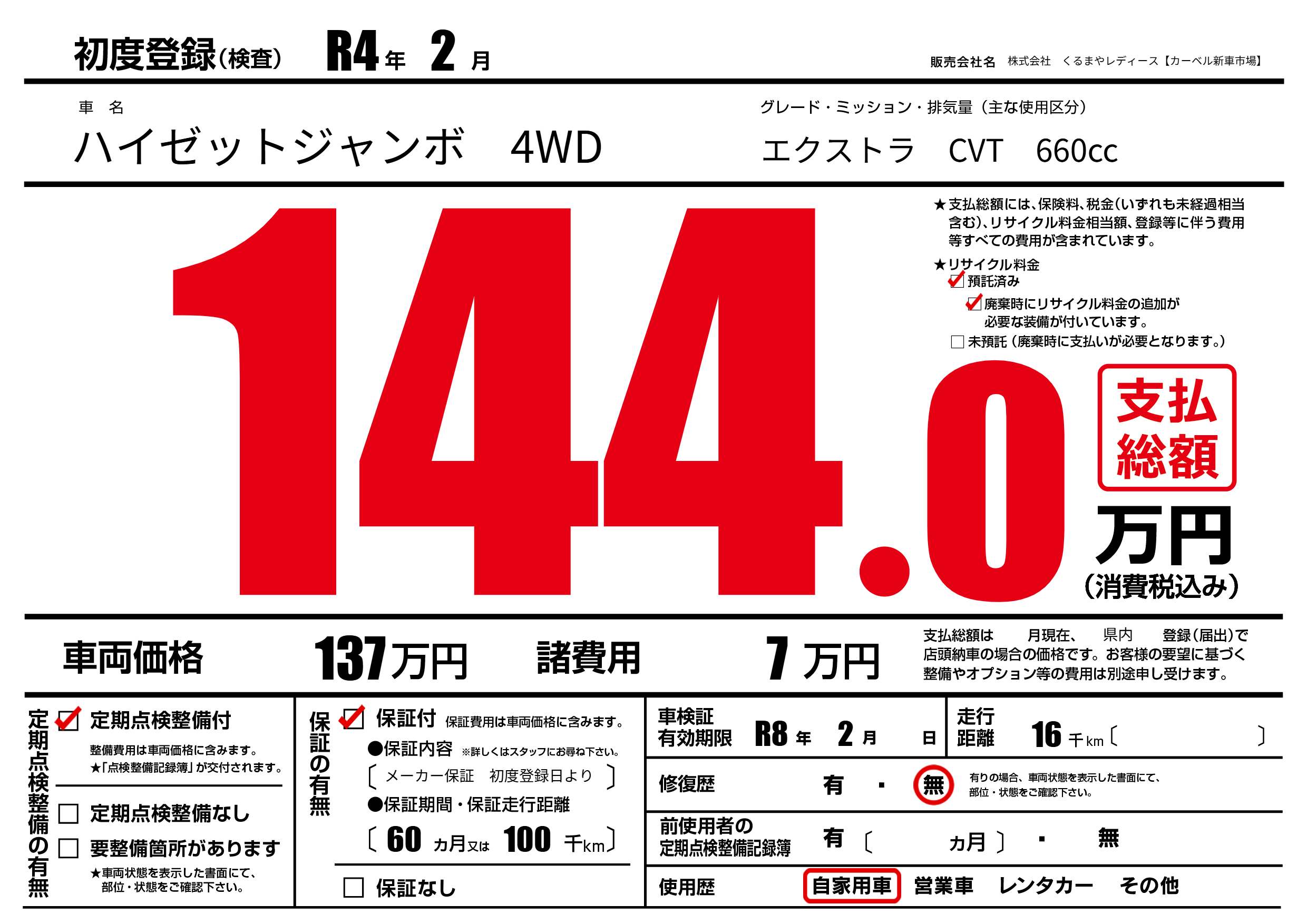 | 車名 | ハイゼットジャンボ 4WD | グレード ミッション 排気量 |