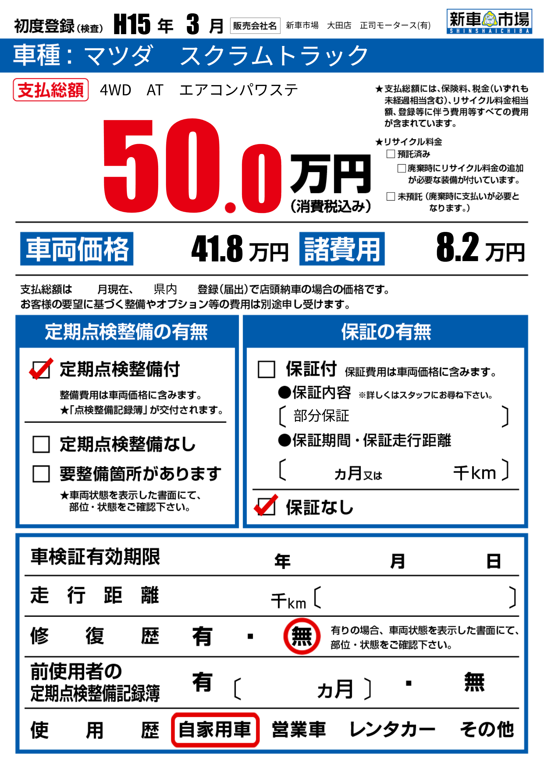 | 走行キロ | - | 初年度登録 | H15年3月 |