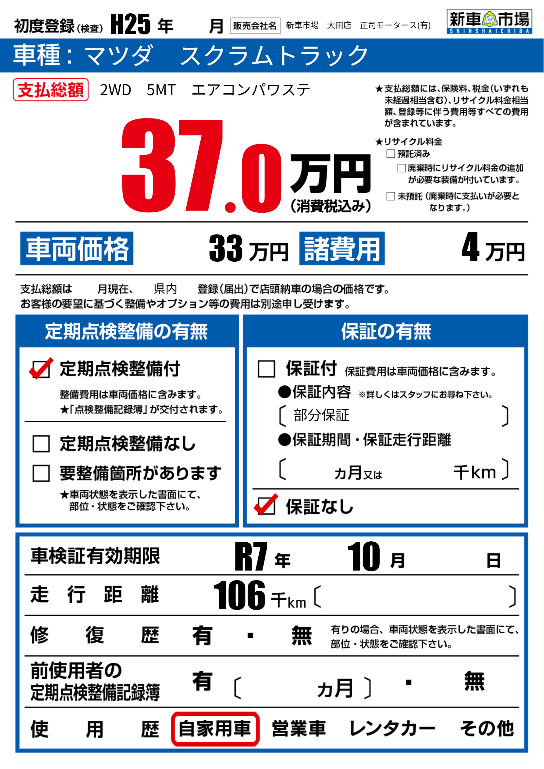 保証なし 保証内容(部分保証) ---ヶ月または()千kmまで |