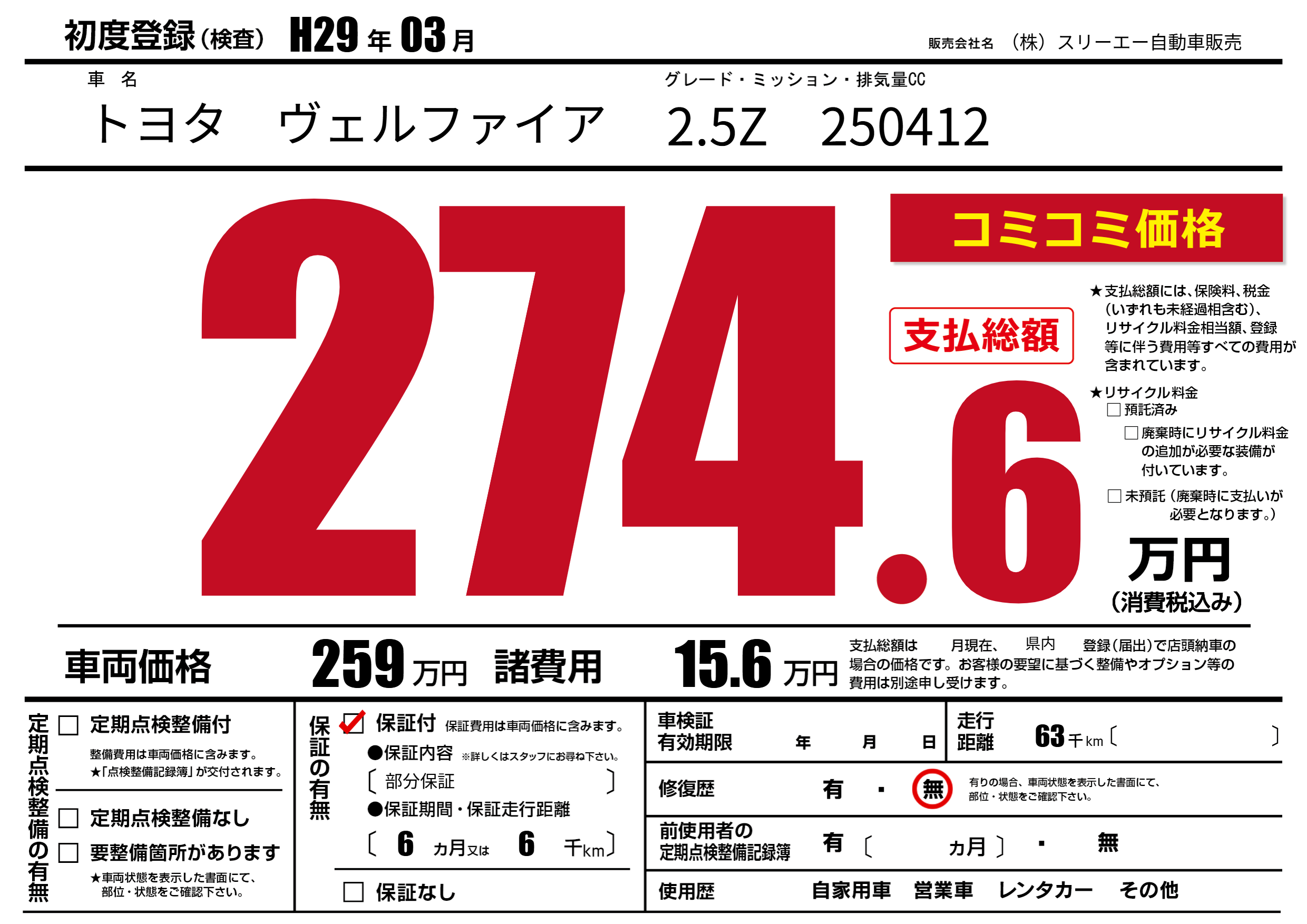 | 走行キロ | 6.3万km | 初年度登録 | H29年03月 |