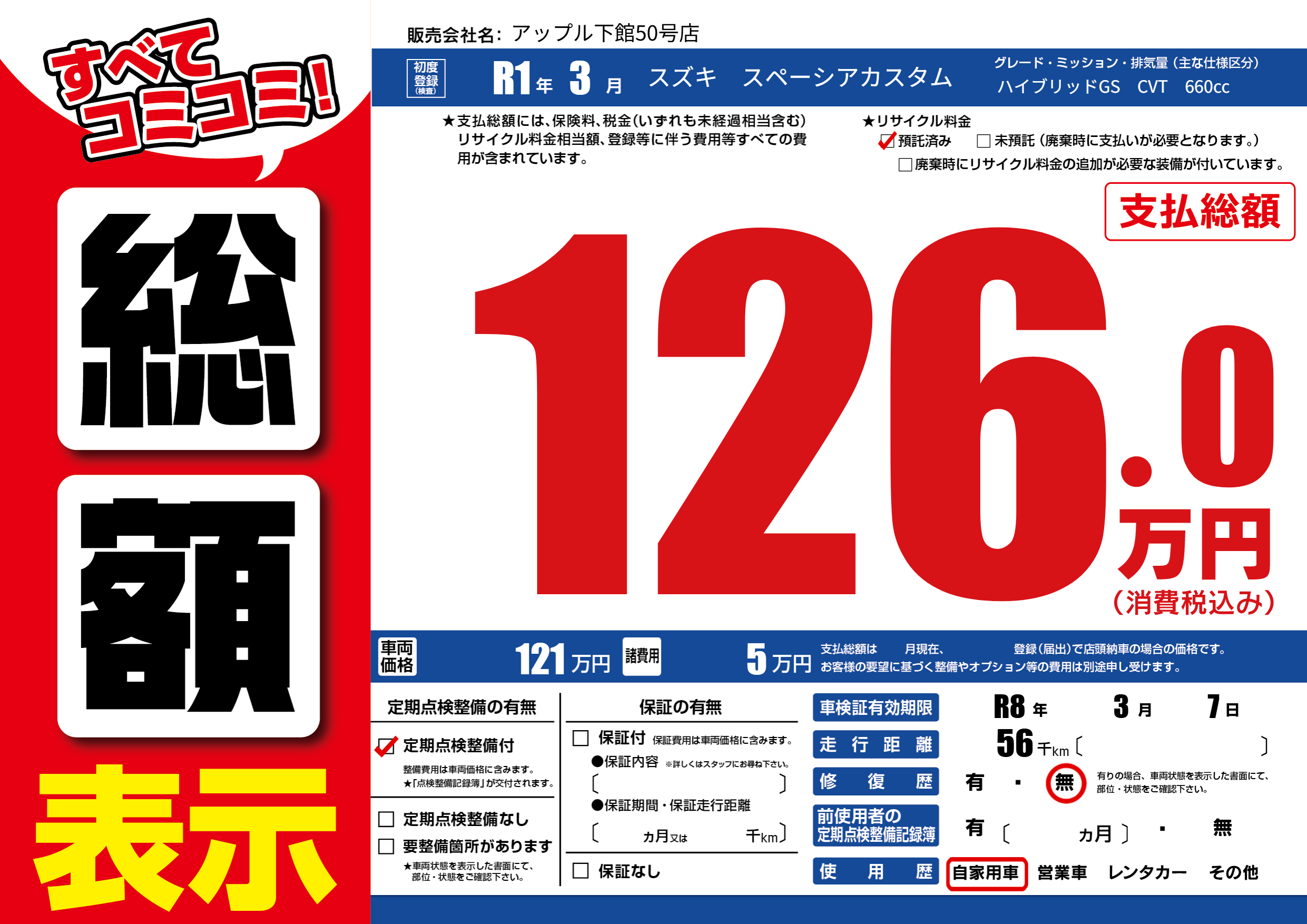 | 車名 | スズキ スペーシアカスタム | グレード ミッション 排気量 |