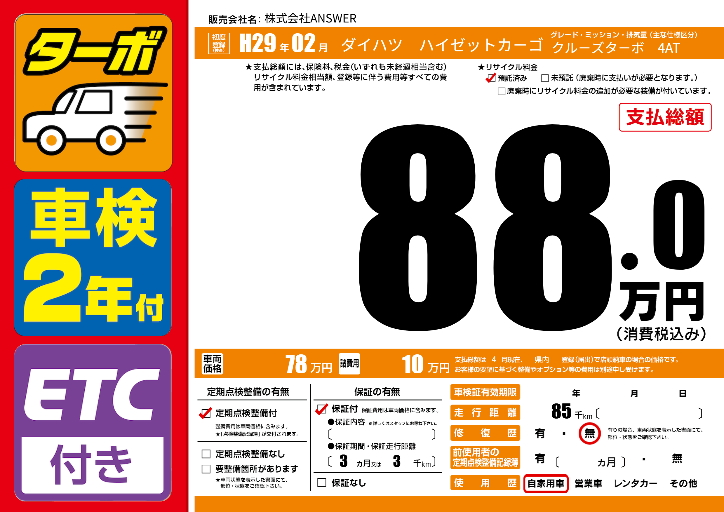 保証付き 保証内容(---) 3ヶ月または(3)千kmまで |