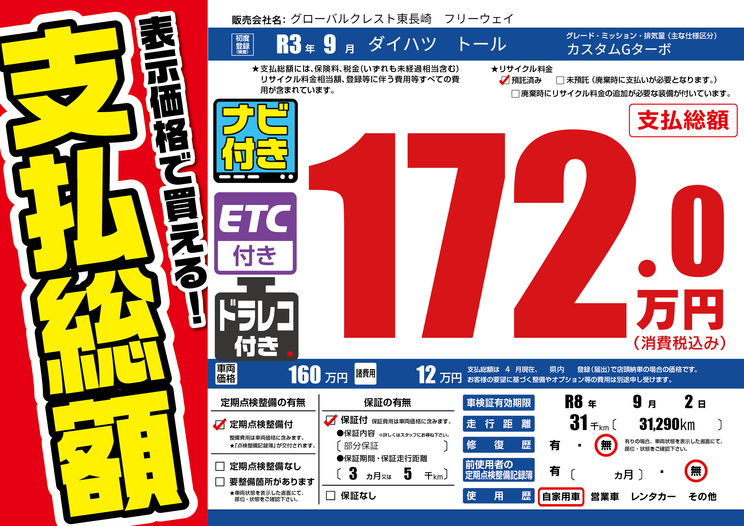 | 走行キロ | 3.1万km | 初年度登録 | R3年9月 |