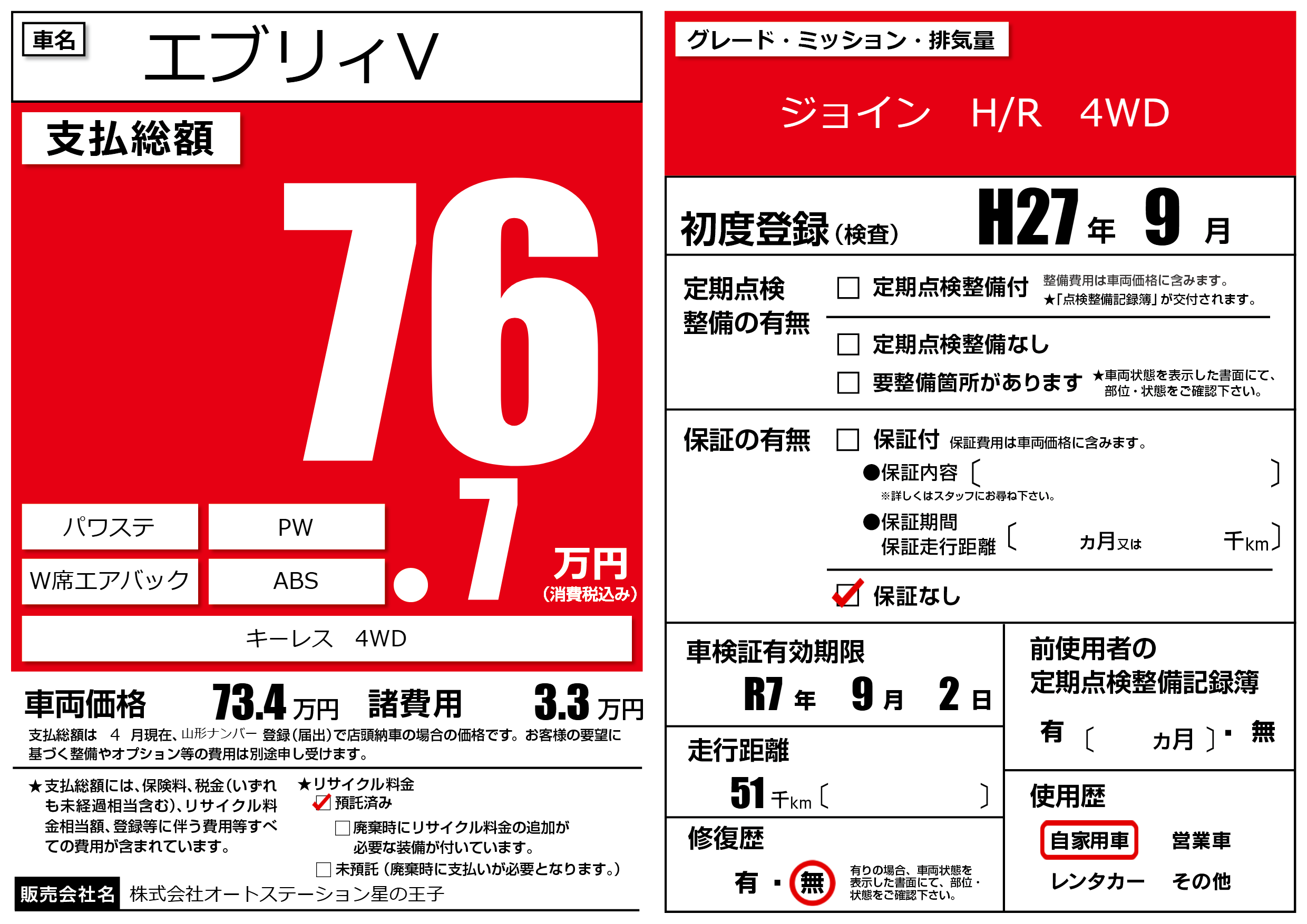 | 車名 | エブリィV | グレード ミッション 排気量 |