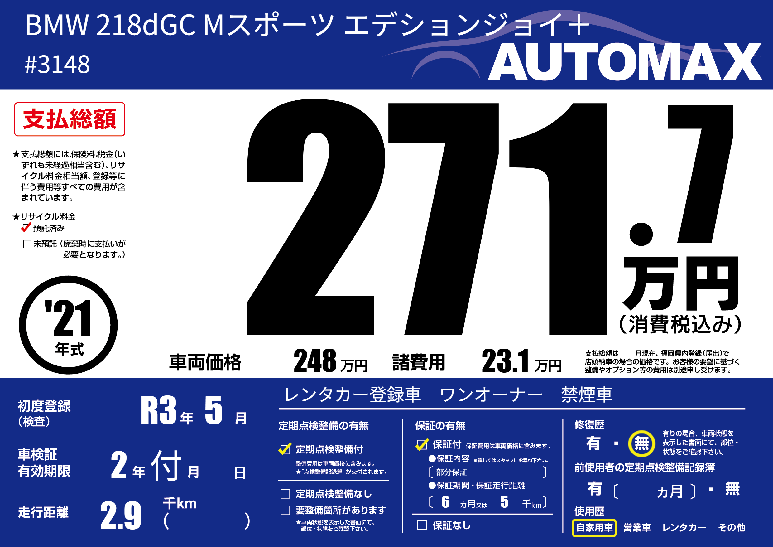 | 車名 | BMW 218dGC Mスポーツ エデションジョイ+ | グレード ミッション 排気量 |