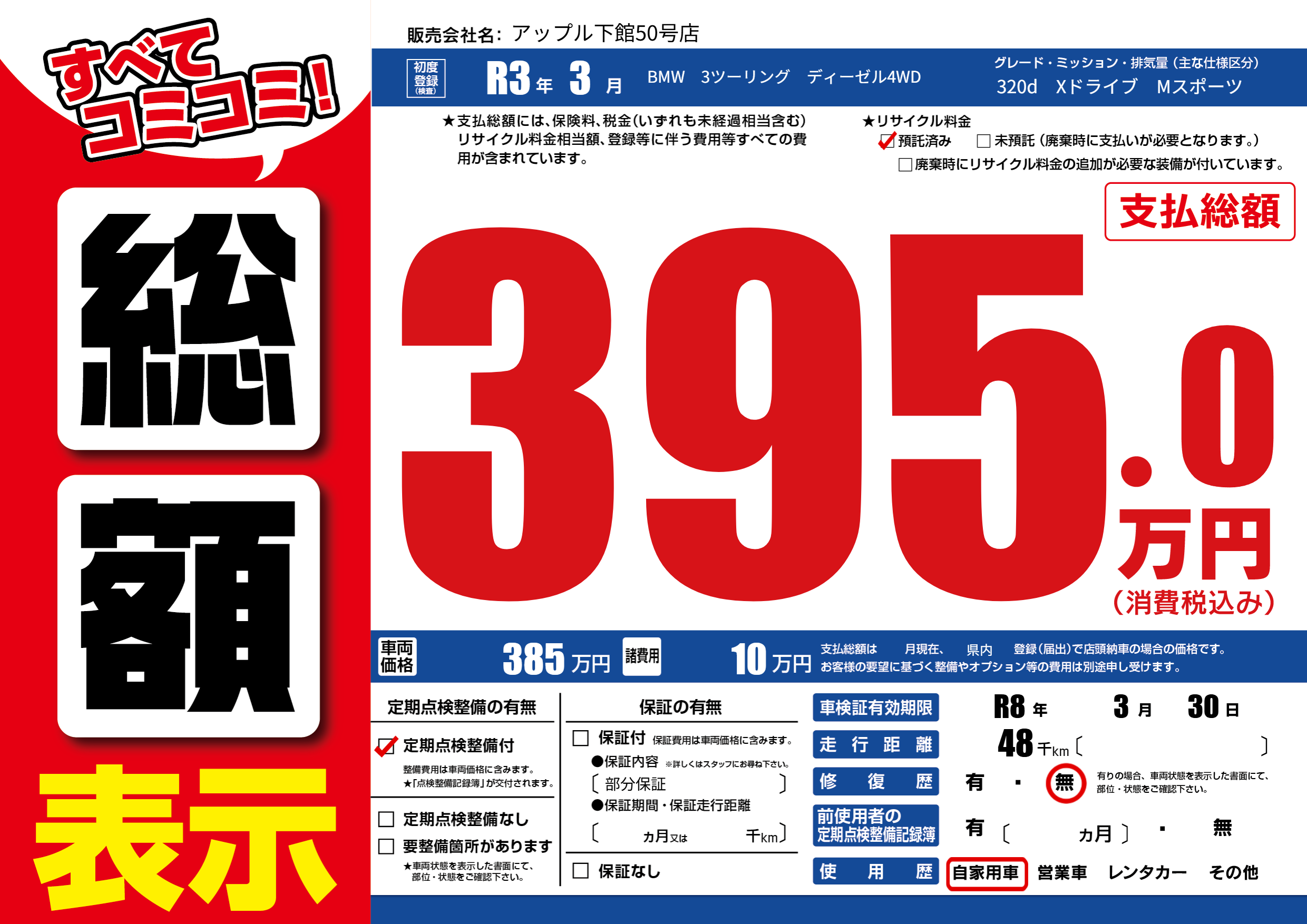 | 車名 | BMW 3ツーリング ディーゼル4WD | グレード ミッション 排気量 |