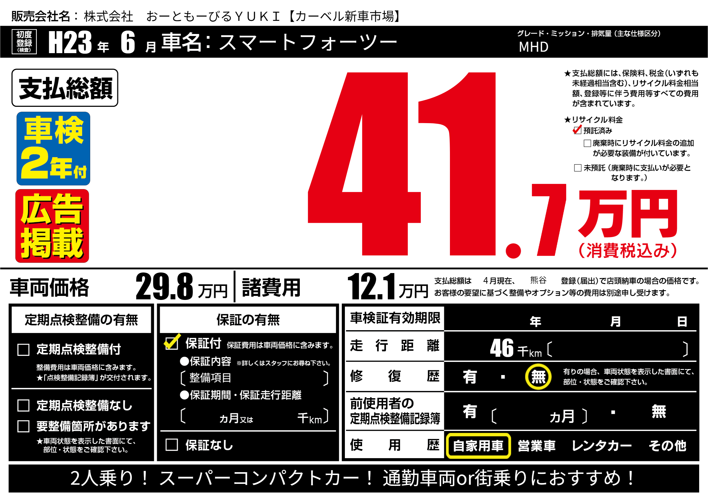 | 車名 | スマートフォーツー | グレード ミッション 排気量 |