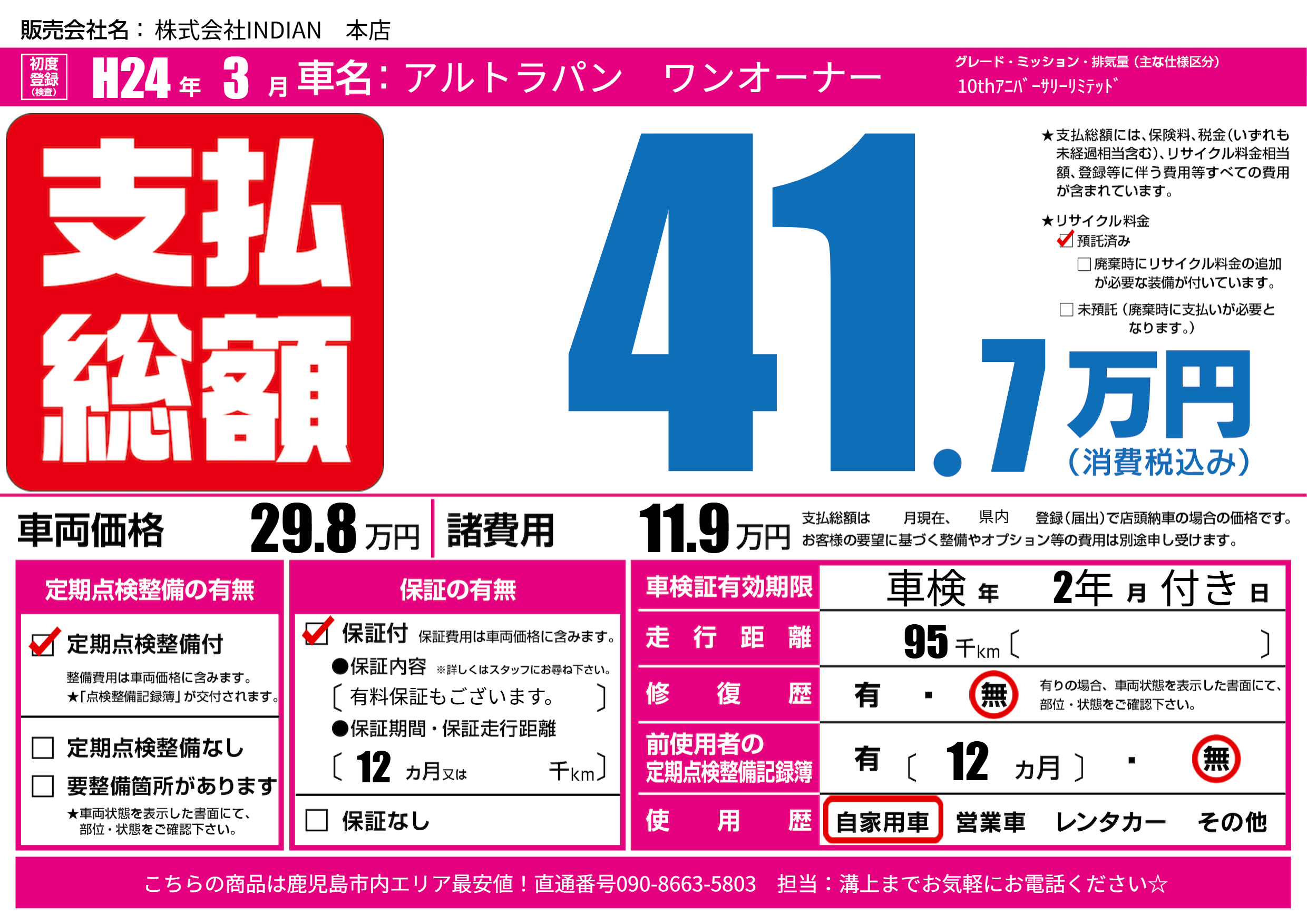 | 走行キロ | 9.5万km | 初年度登録 | H24年3月 |