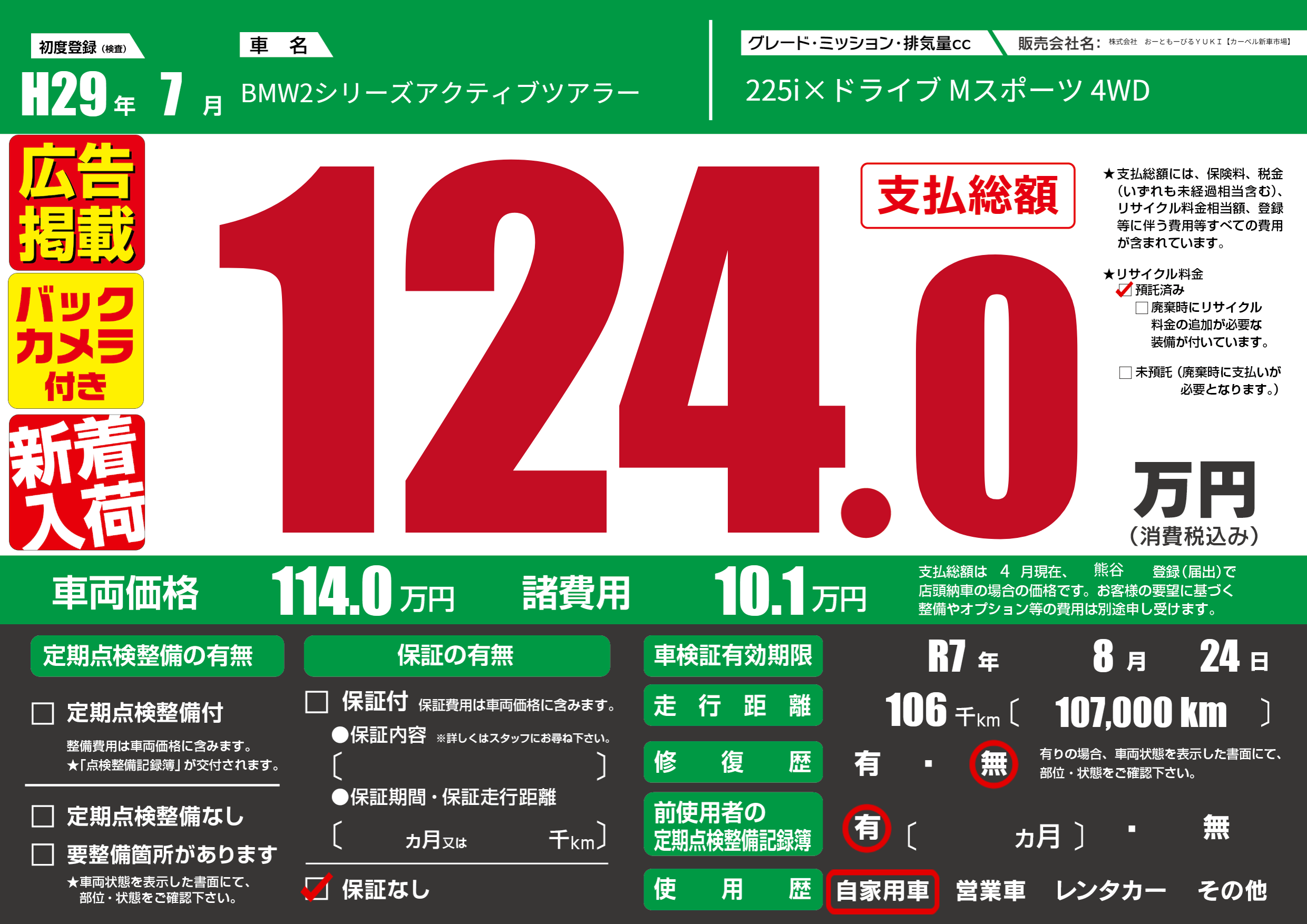| 車名 | BMW2シリーズアクティブツアラー | グレード ミッション 排気量 |