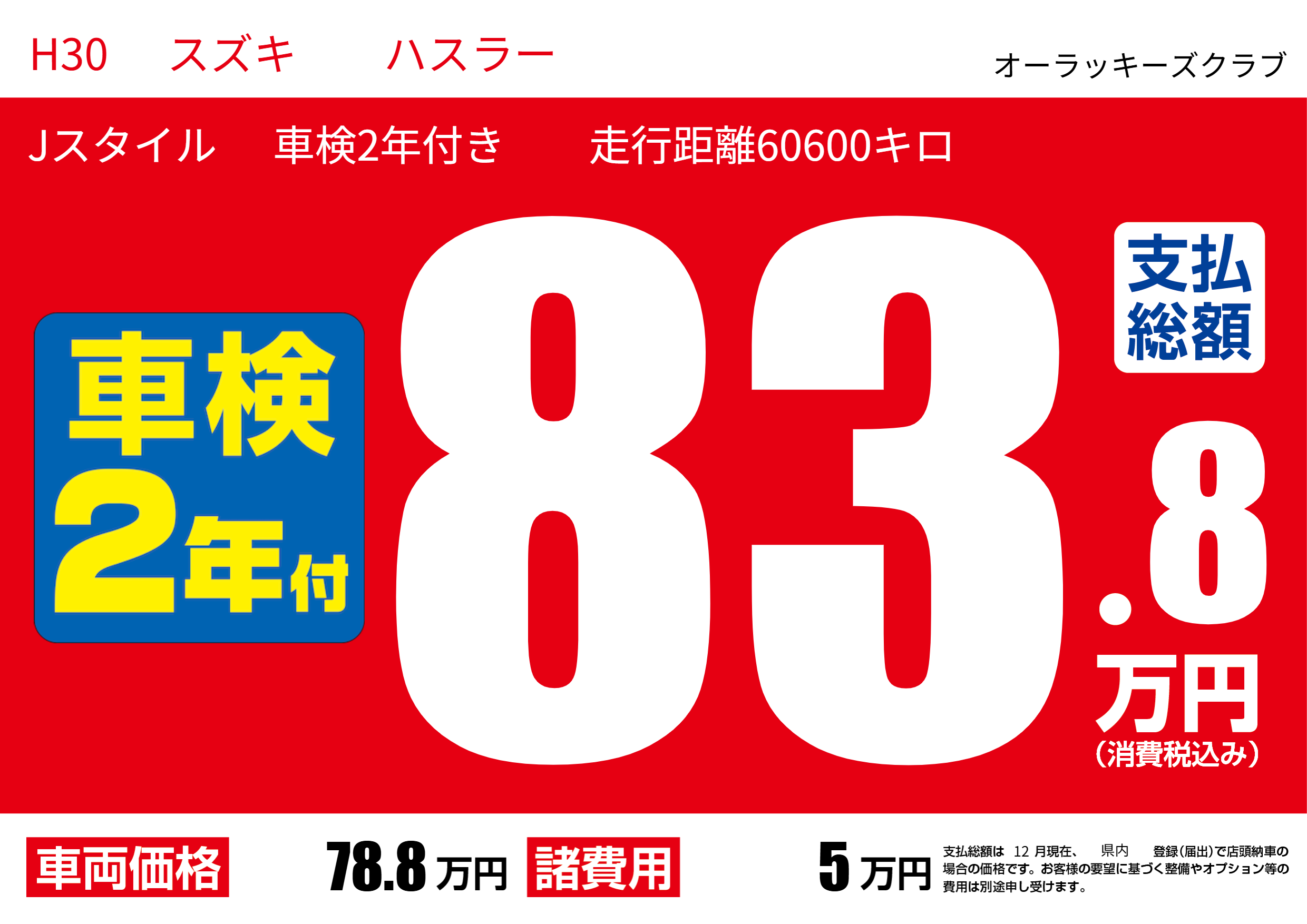 | 車名 | H30 スズキ ハスラー | グレード ミッション 排気量 |