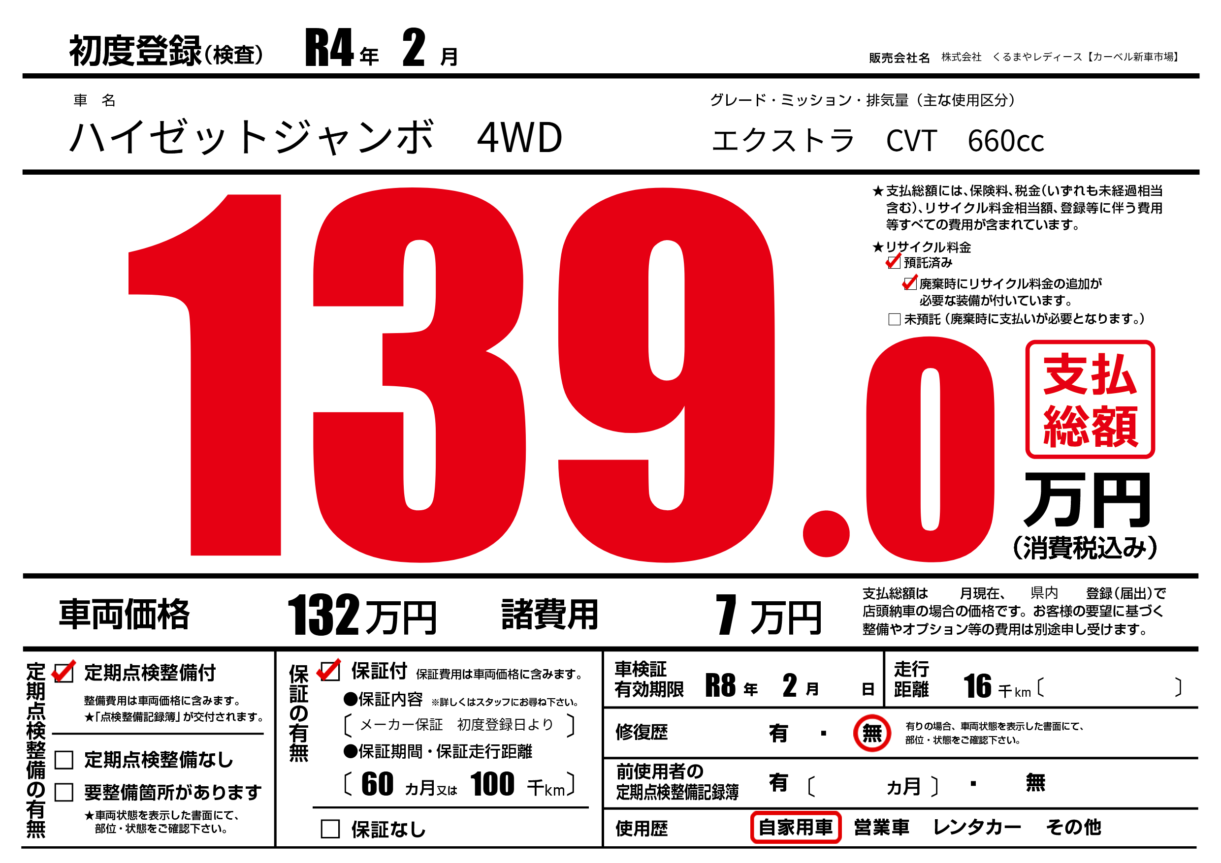| 車検制限 | R8年 2月 - 日 | ||