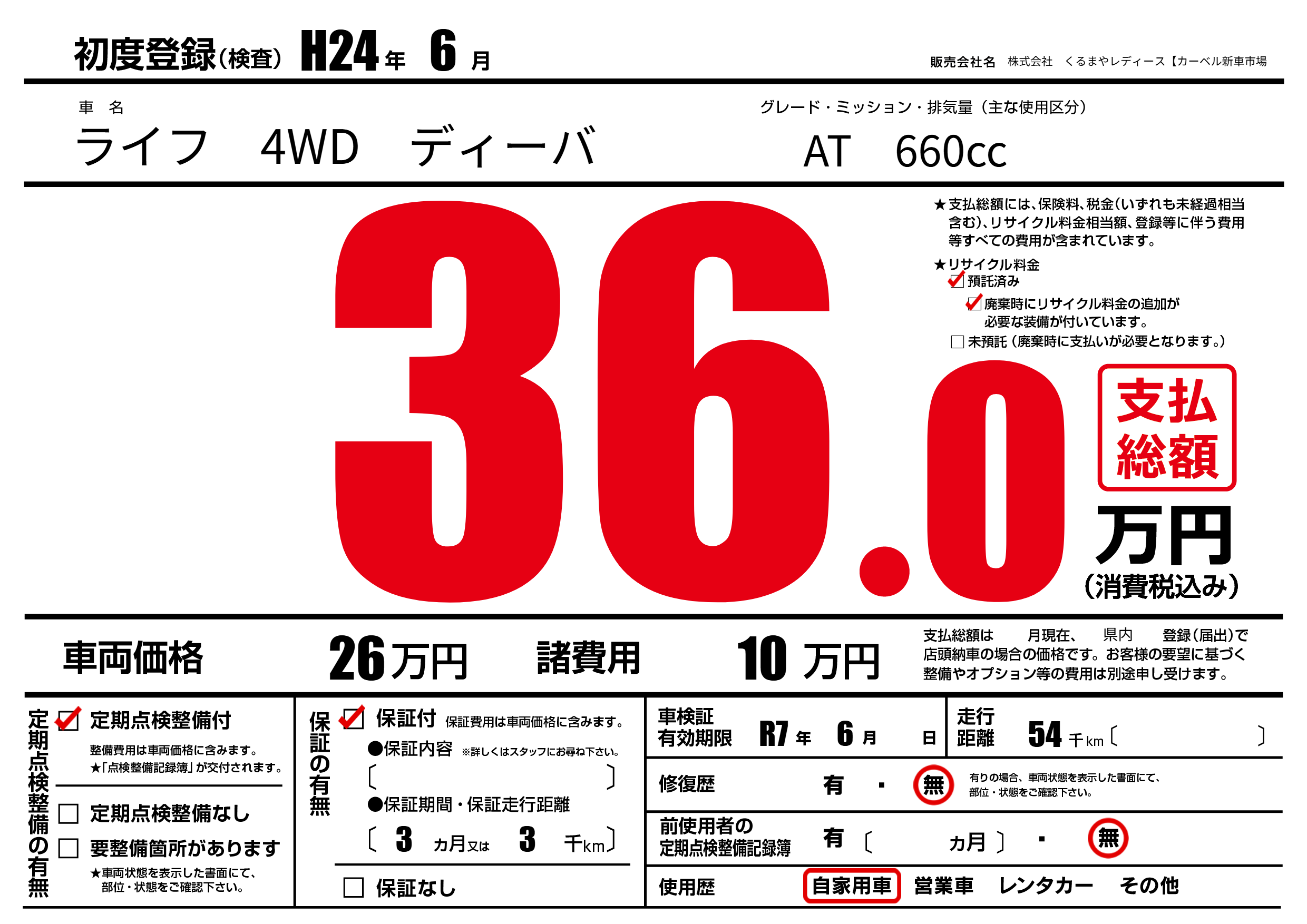 | 車検制限 | R7年 6月 - 日 | ||