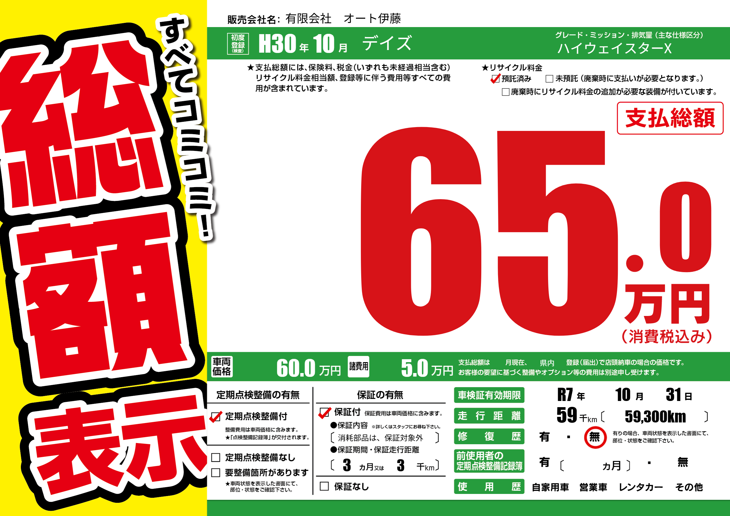 | 車名 | デイズ | グレード ミッション 排気量 |