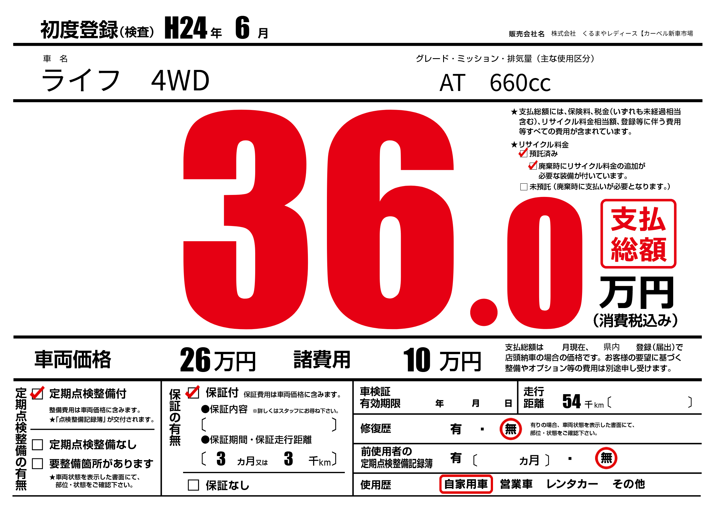 | 車名 | ライフ 4WD | グレード ミッション 排気量 |