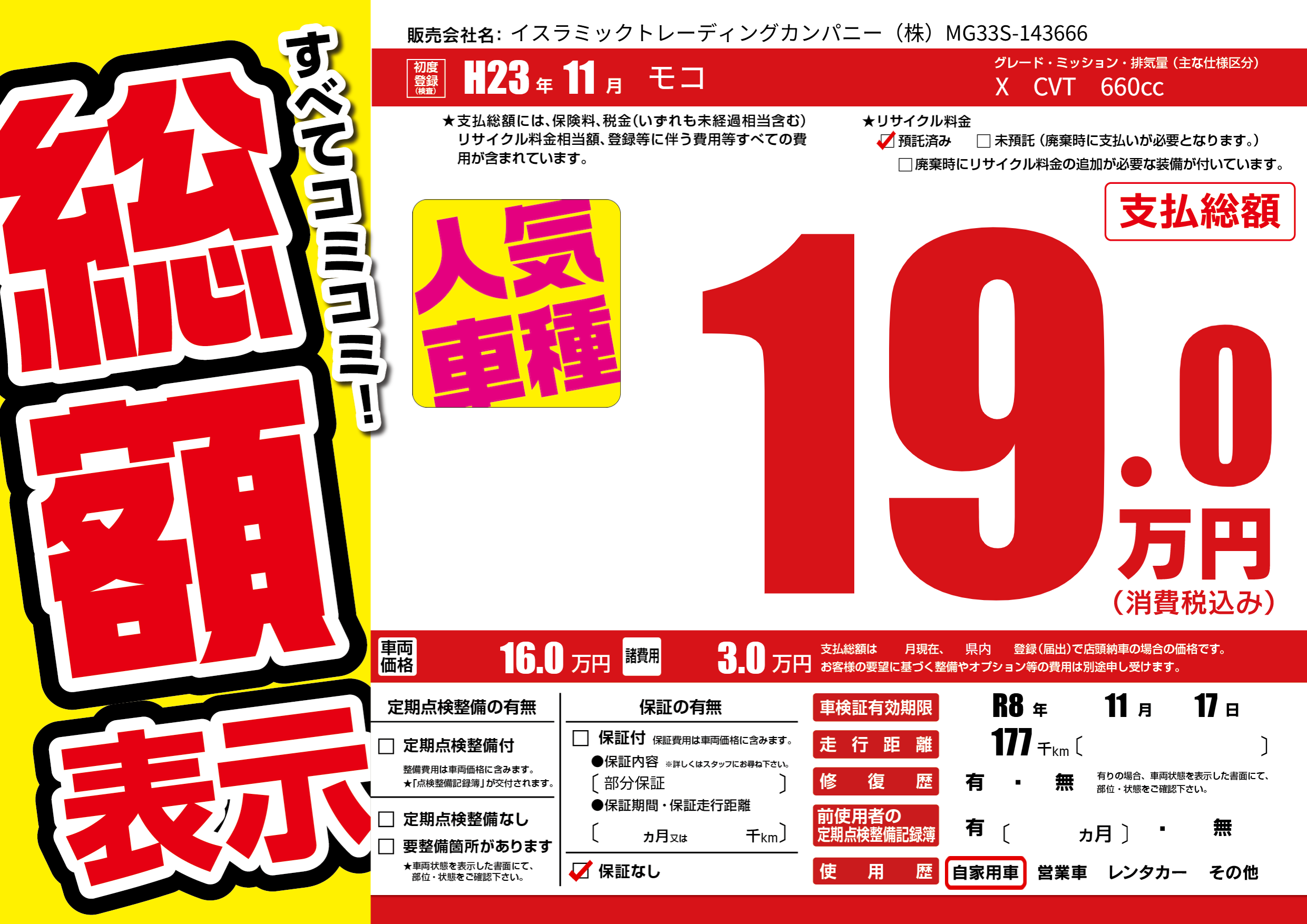 | 走行キロ | 17.7万km | 初年度登録 | H23年11月 |